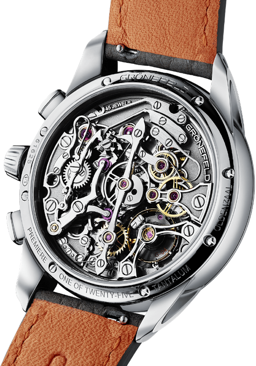 The mainplate is embellished with spotting, while the bridges are formed of stainless steel, polished by hand. Moreover, the bridges have micro-blasted centres, circular graining on the top and feature various engravings in relief. The heart-shaped cams, the elongated chronograph bridge, the gold chatons and the screw-heads are embellished with black polishing, performed in the traditional way using diamond paste on a tin plate. Consistent with earlier Grönefeld watches, the finishing is worthy of the term ‘Haute Horlogerie’. Indeed, everything is reassuringly Grönefeld.