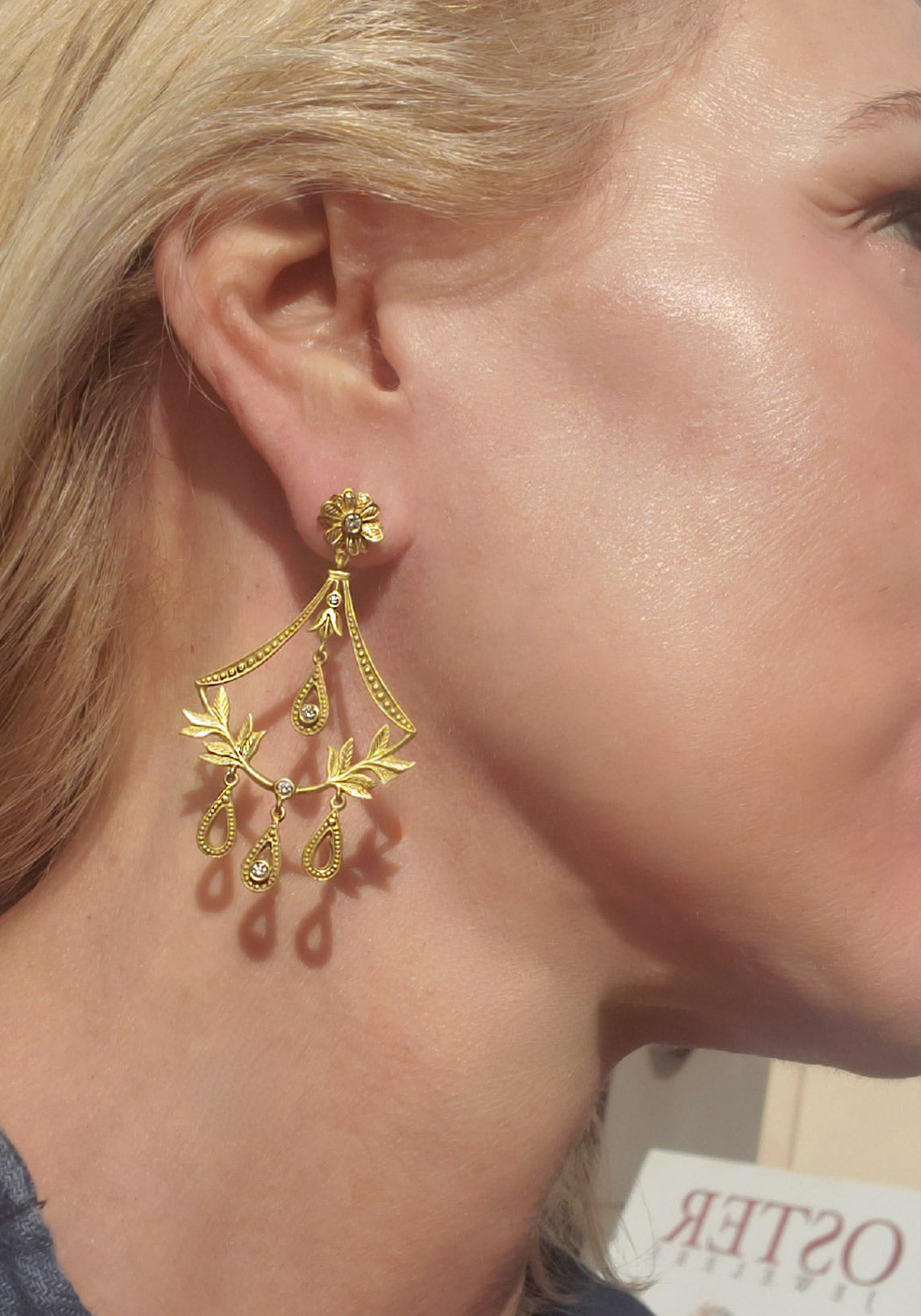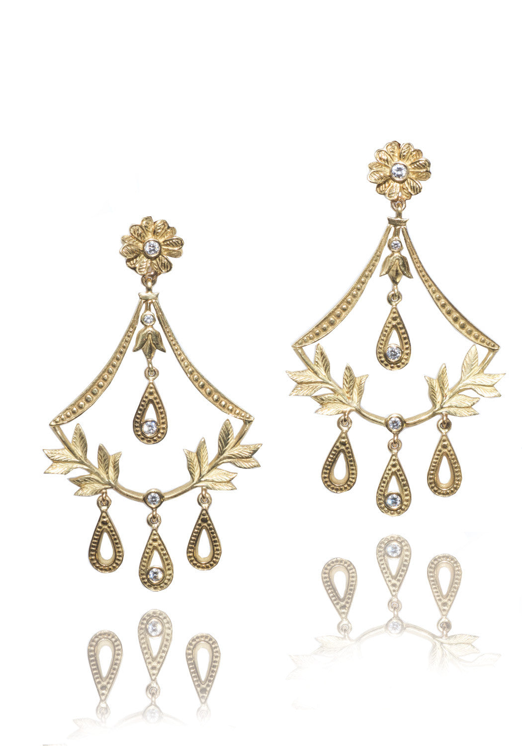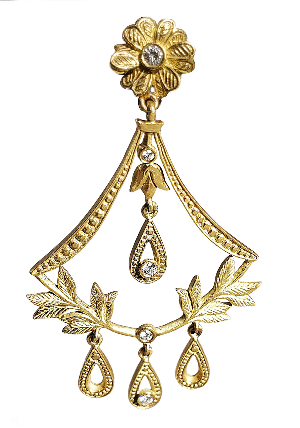 Jamie Wolf 18KYG Floral Diamond Chandelier Earrings capture the essence of opulence and sophistication. Inspired by her years as a ballet dancer, Jamie Wolf's designs are always very feminine and fanciful as seen on these exquisite earrings. Showcased in gold with an intricate handcrafted design of delicate leaves and flowers, gorgeous accents of brilliant diamonds shimmer with every movement.