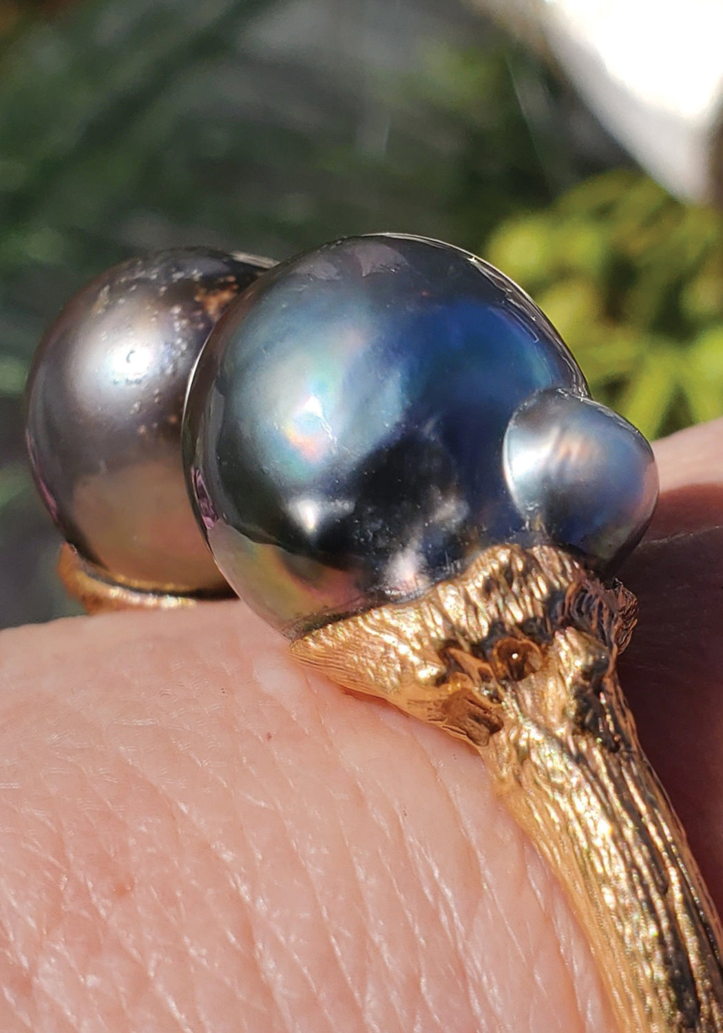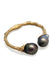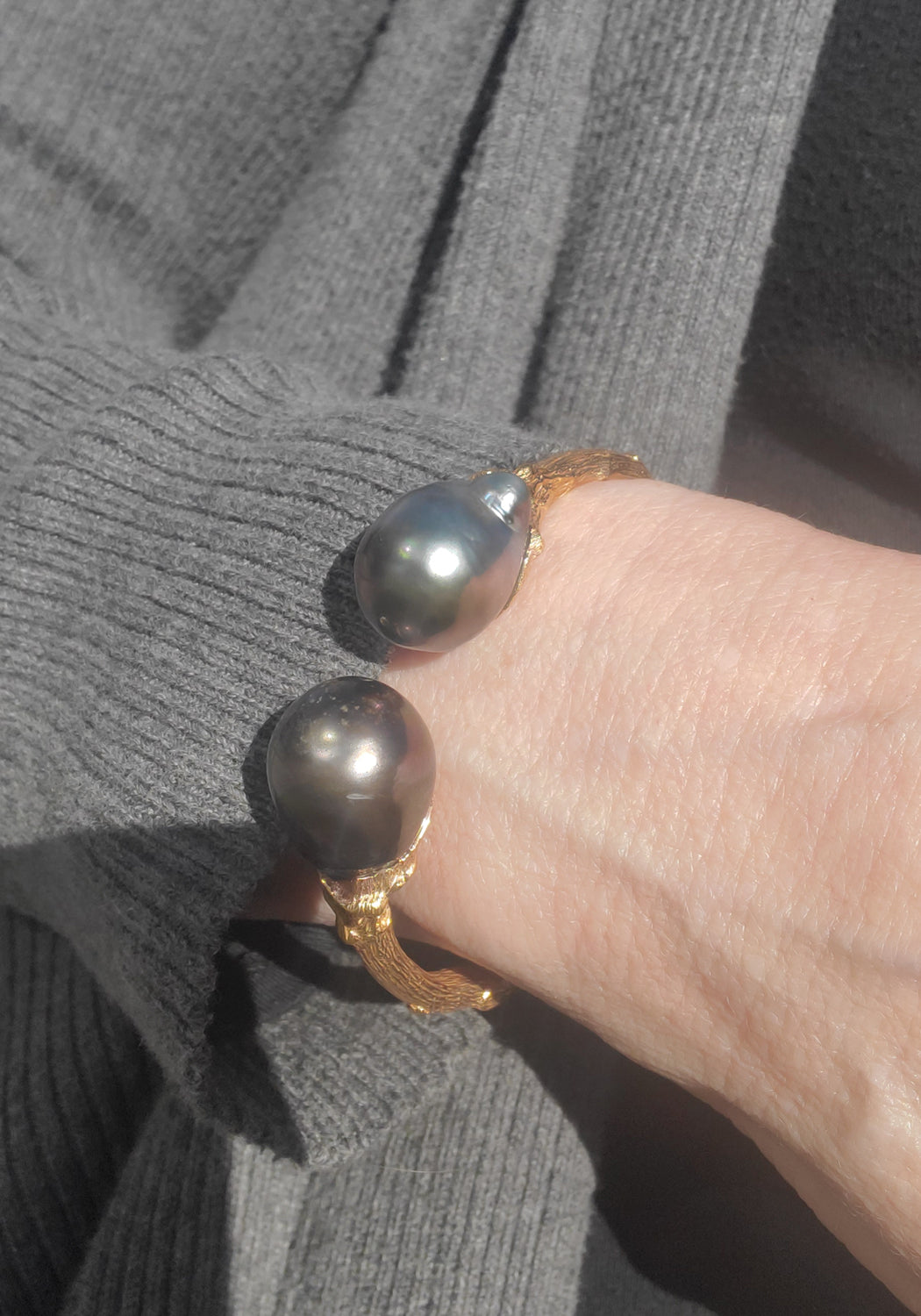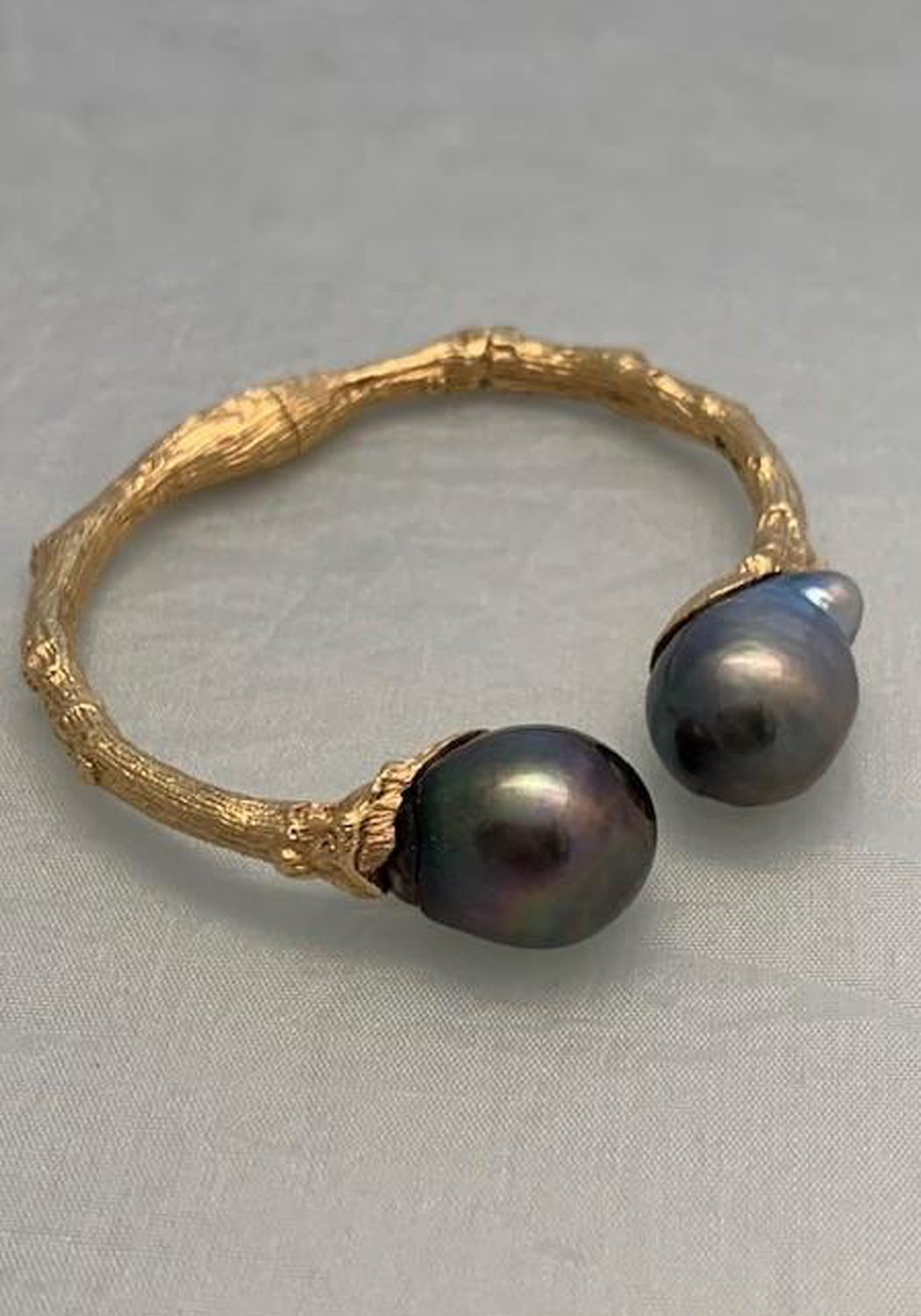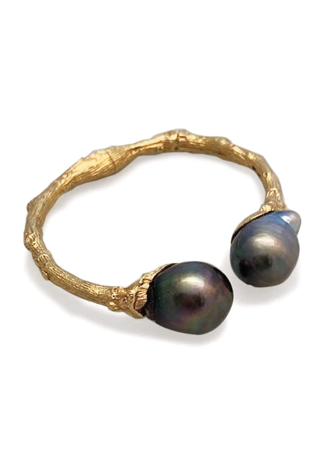 Embodying the very essence of energy, this stunning K. Brunini Tahitian pearl twig cuff bracelet showcases a dynamic torque shape. Two exquisite Tahitian pearls enhance the design, radiating an aura of elegance and mystery. The dark, decadent pearls are magnificently complemented by K. Brunini's signature twig motif in 18k rose gold, creating a harmonious blend of nature and luxury. The hinged clasp design ensures effortless accessorizing, making this piece perfect for those on the go. Whether dressing up for a special occasion or adding a touch of sophistication to your everyday ensemble, this bracelet is a timeless addition to any jewelry collection. The intricate details and superior craftsmanship highlight the beauty of natural elements, making it a true statement piece.