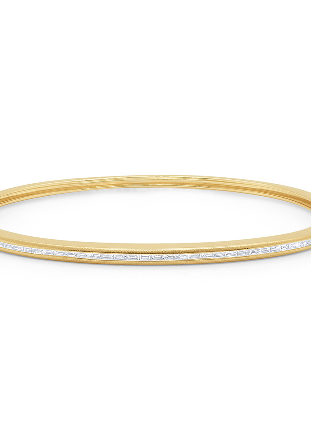 This  14KYG Baguette Diamond Bangle Bracelet is the quintessence of elegance and versatility. A sleek and sophisticated piece, this bracelet features a series of meticulously cut baguette diamonds arranged in a harmonious sequence that captures and reflects the light with every movement. Crafted with precision and care, this bangle stands out for its minimalist design and impactful sparkle, making it a stunning accessory to grace the wrist. Whether worn as a standalone statement piece or layered with other bracelets for a more dynamic and personalized look, this baguette diamond bangle offers endless styling possibilities. It seamlessly transitions from day to night, adding a touch of luxury and refinement to any ensemble. Embrace the timeless beauty and contemporary charm of this exquisite bangle, a must-have addition to any jewelry collection seeking to combine classic elegance with modern flair.