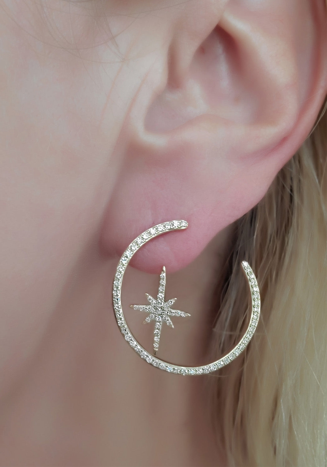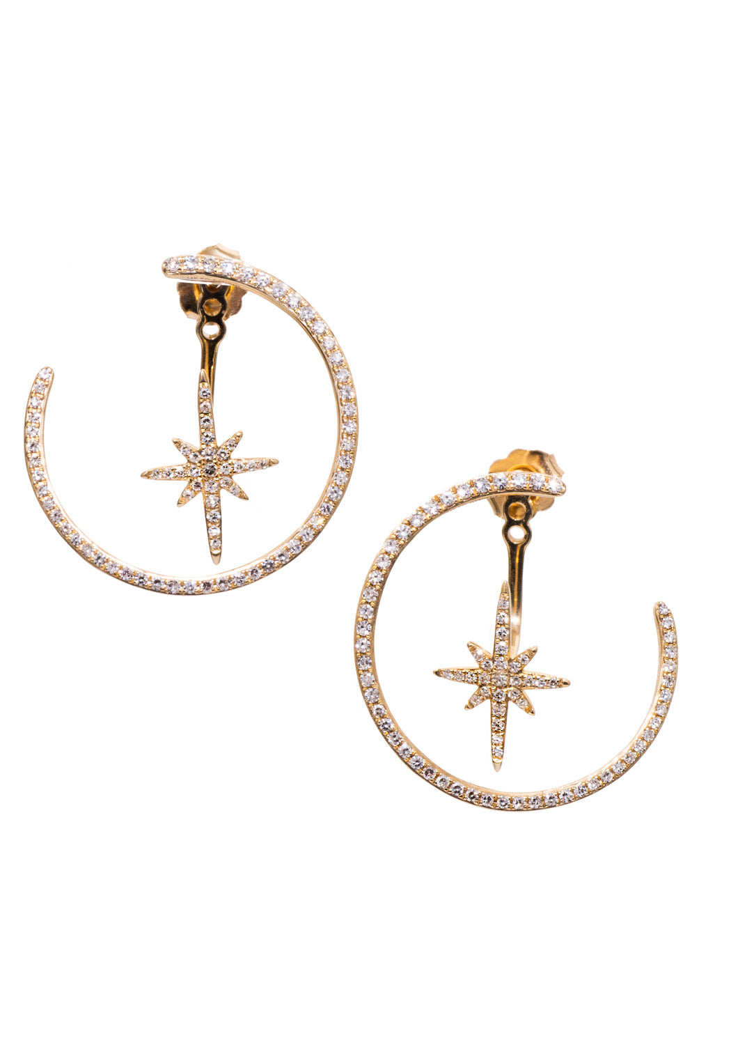 Reach for the stars with this unique take on the classic hoop. Two earrings in one with removable star jacket that attaches behind the lobe crating a floating appearance. Jackets have three lengths and may be worn with your own studs. Dazzling diamonds shine against 14k yellow gold on these fabulous MO & ME 14KYG Diamond Hoop Earrings With Star Backs that'll jazz up every look. Featuring .60ctw of white diamonds.