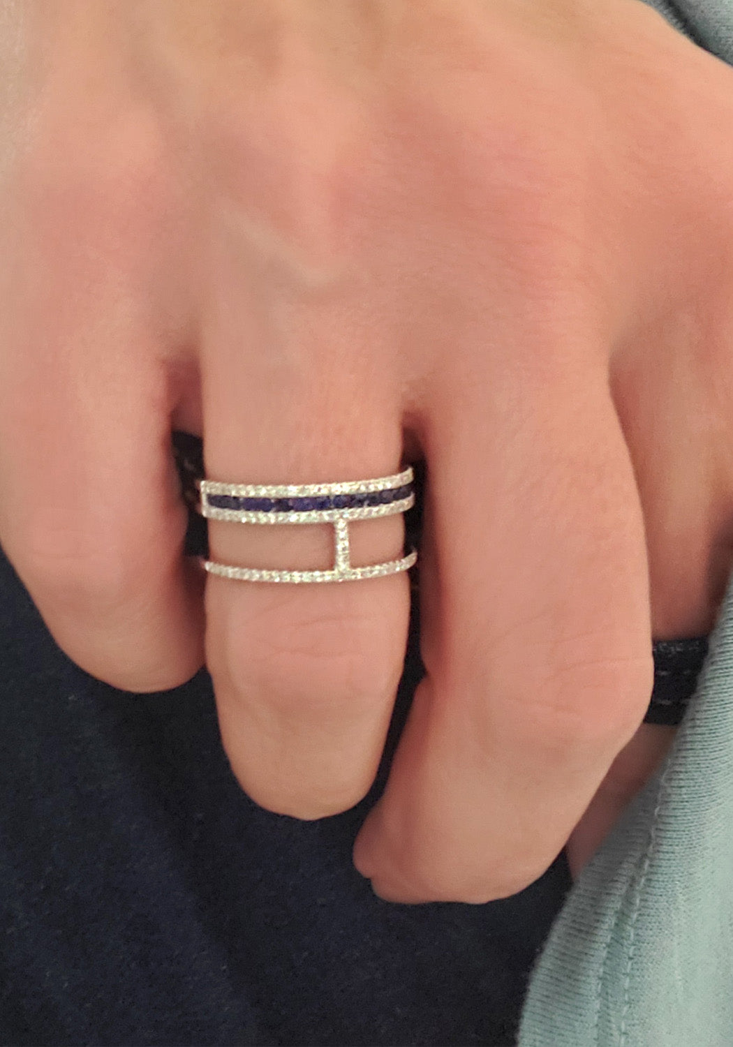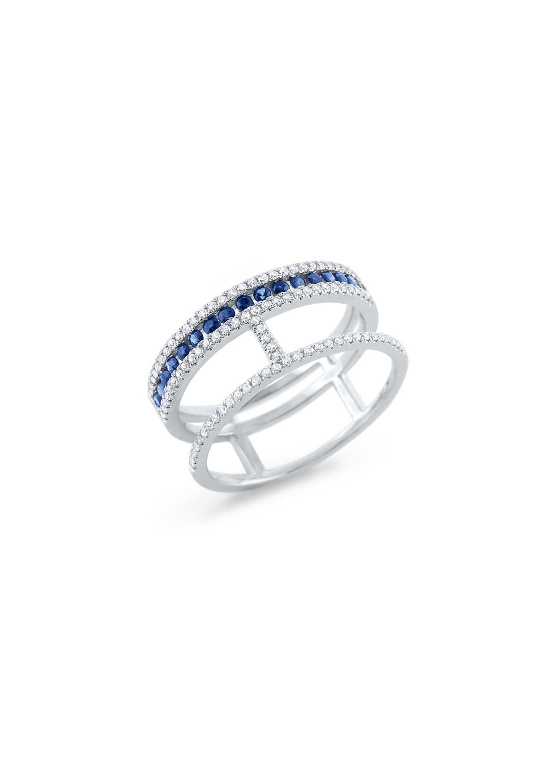 This striking MO & ME 14KWG Diamond & Sapphire Double Row Open Ring really makes a statement with an open design highlighting the brilliant blue hue of September's birthstone, sapphire. Add a beautiful pop of sophisticated color to your every day with this trendy ring that pairs cerulean blue sapphires and sparkling round diamonds. Featuring .31ctw of sapphires and .29ctw of diamonds. Ring measures 3/8" wide.
