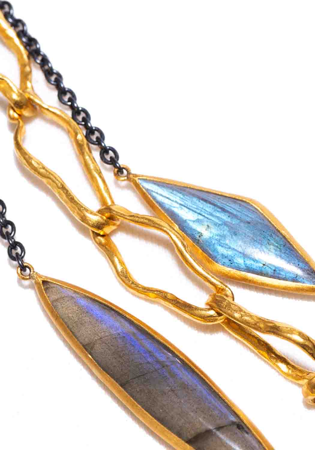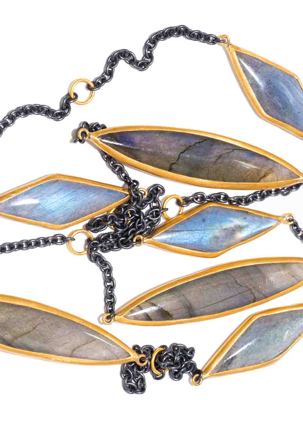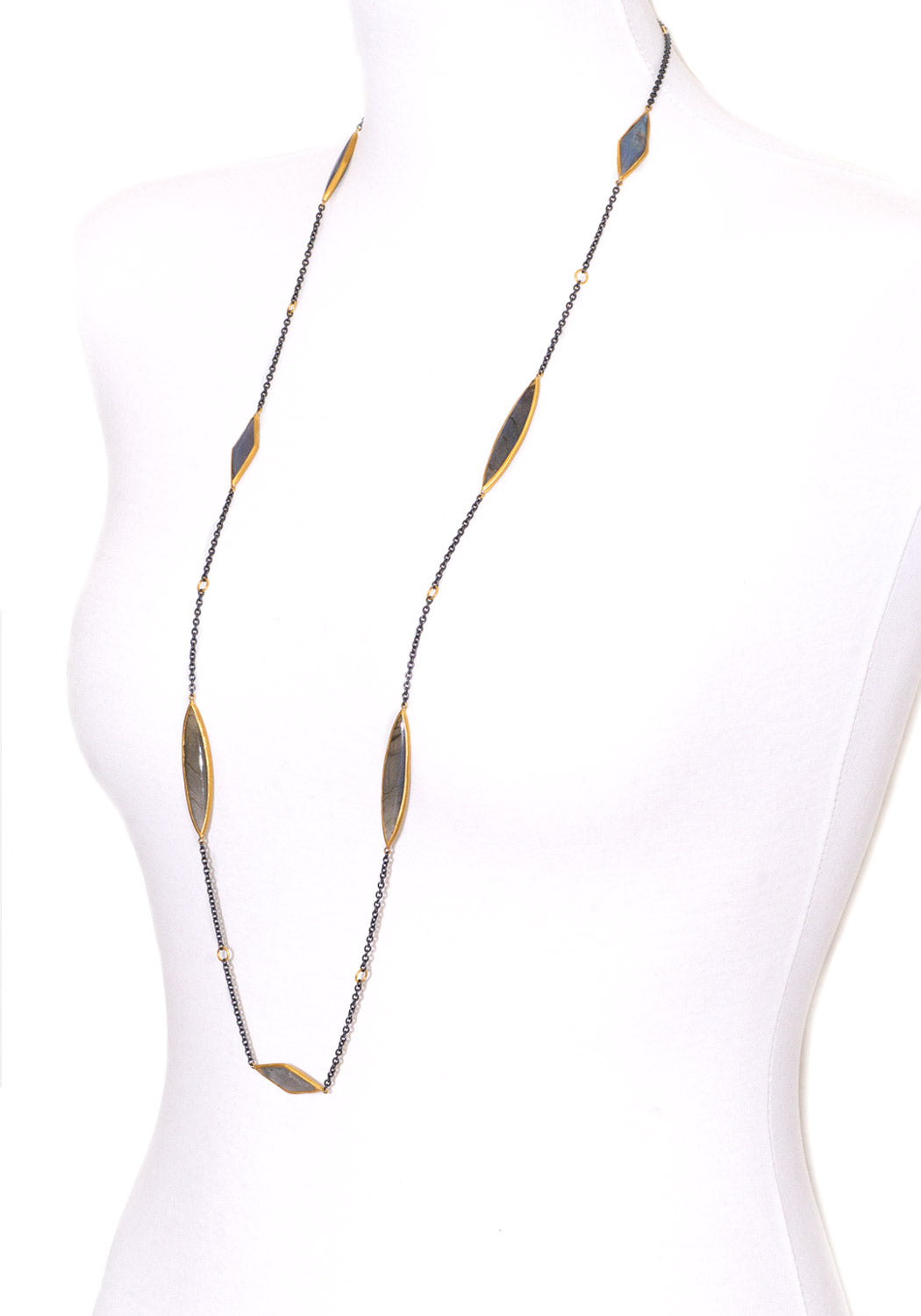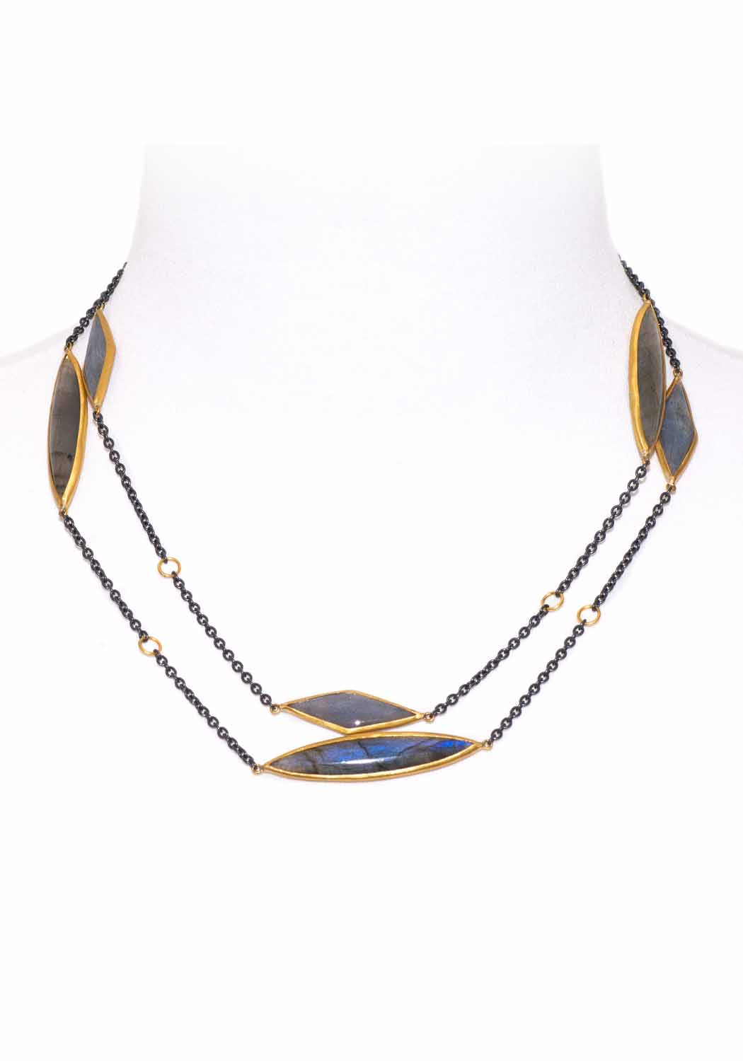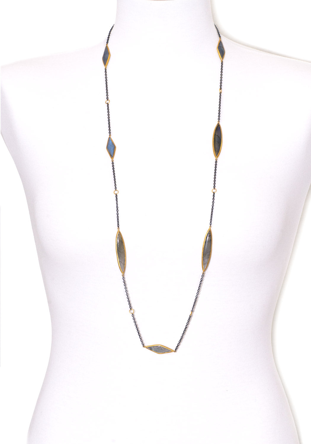 Labradorite shifts and shimmers on Lika Behar's long and elegant Kara necklace. The marquise shaped labradorite cabochons are bezel set in 24k yellow gold and dance bewitchingly while stationed suspended between oxidized sterling silver chain. A must have accessory for your favorite casual or evening wear looks. At 38 inches in length it can be worn as a single long strand, or draped for a more dramatic effect. Finished with a lobster clasp. Smaller settings sized approximately 1. 1/4" in length. Largest setting is approximately 2.7/8" in length.
