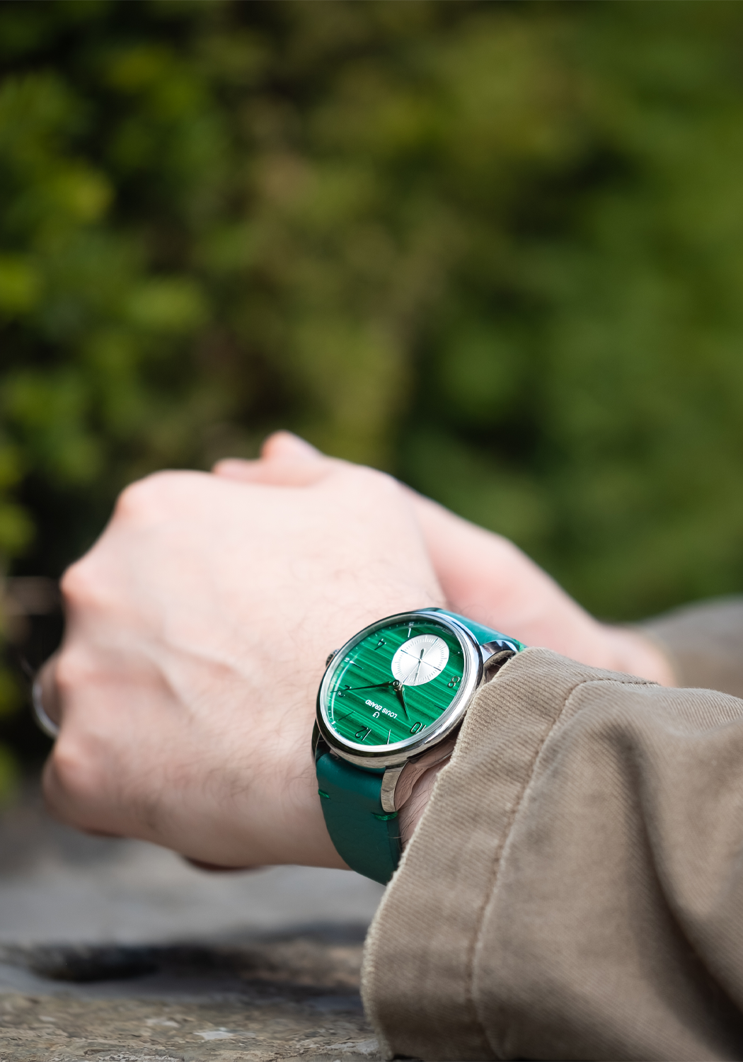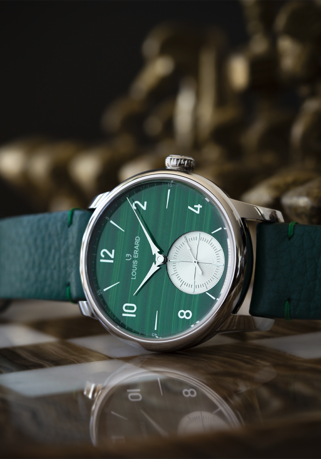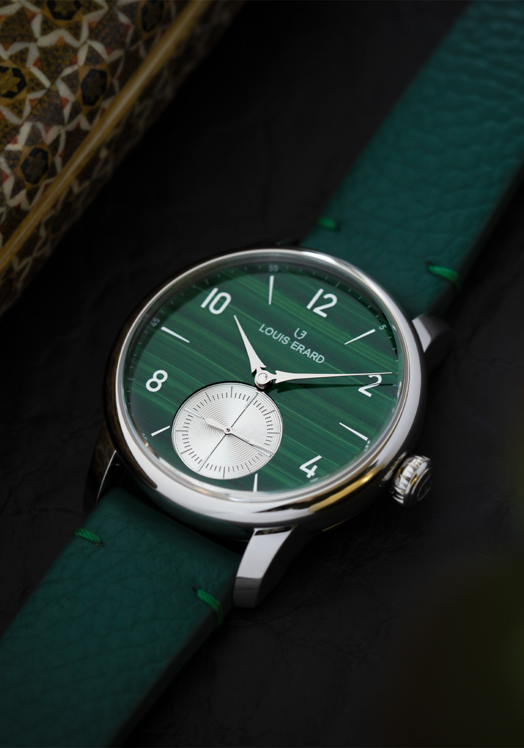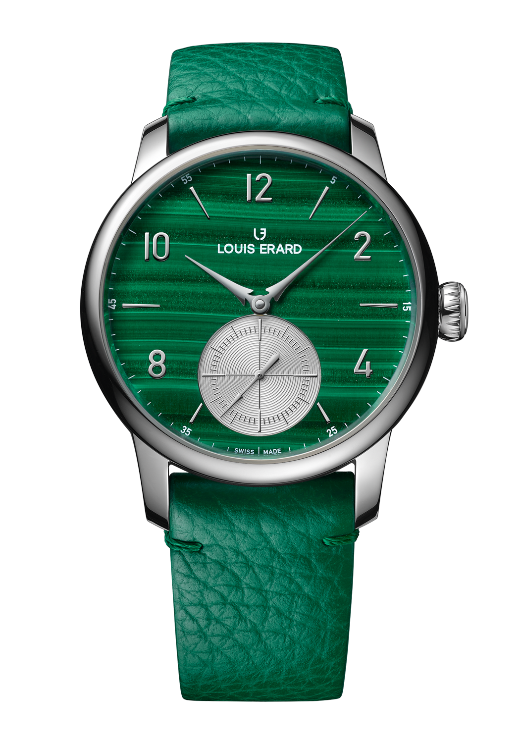 The new limited edition Petite Seconde series from the Excellence collection features a trinity of natural stones celebrating the sky, trees, and earth of the Jura region where Louis Erard was founded. Like the Régulateurs of 2021, these new Petite Seconde timepieces show off the interplay of materials and colors with the forest green of malachite (shown), the morning blue of lapis lazuli, and the midnight blue of aventurine.