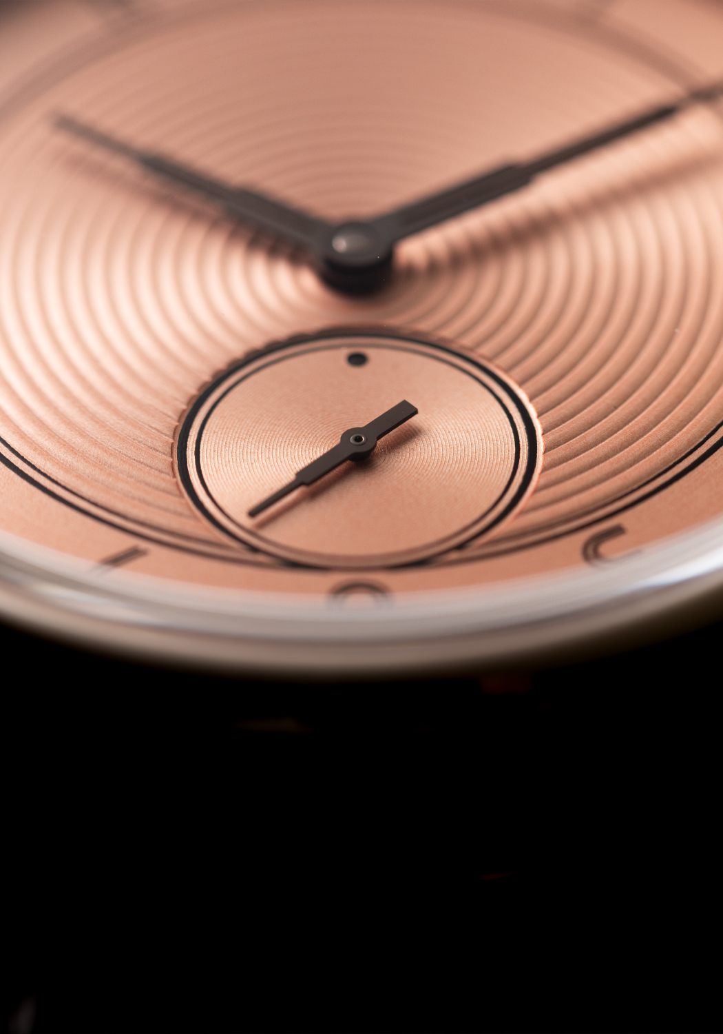 La Petite Seconde Metropolis Louis Erard x The Horophile in Salmon shows off a salmon dial with a circular satin-finish exterior and counter, gadrooned center, and black transfers. The Metropolis firmly pays tribute to the architecture and design of the 1920s, while bringing it forth to modern times. This influence is seen from the rounded numerals to the Empire state inspired baton-shaped hands. A black grained calf leather strap handsomely complements the design, while offering supreme comfort on the wrist. Its functional catch spring bars allow for the strap to be changed effortlessly.