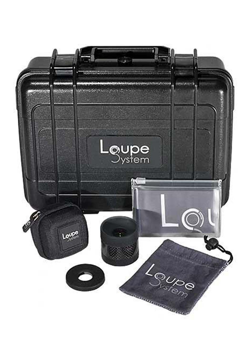 The loupe is provided with two interchangeable silicone rubber eyecups. The standard one gives a 40mm-wide viewing field. The alternative flat eyecup places the eye closer to the loupe, thus providing a wider 50mm viewing field. Each loupe is delivered with its alternative silicone rubber eyecup, a microfiber carry pouch, and a hard shell carry case. All elements are packed in an ABS waterproof case, which is enclosed in a cardboard shipping box. A second inner foam set is also included for the ABS shipping case, allowing you to transform it into a four-watch dust-proof, water-proof and crush-proof transport case.