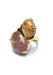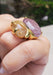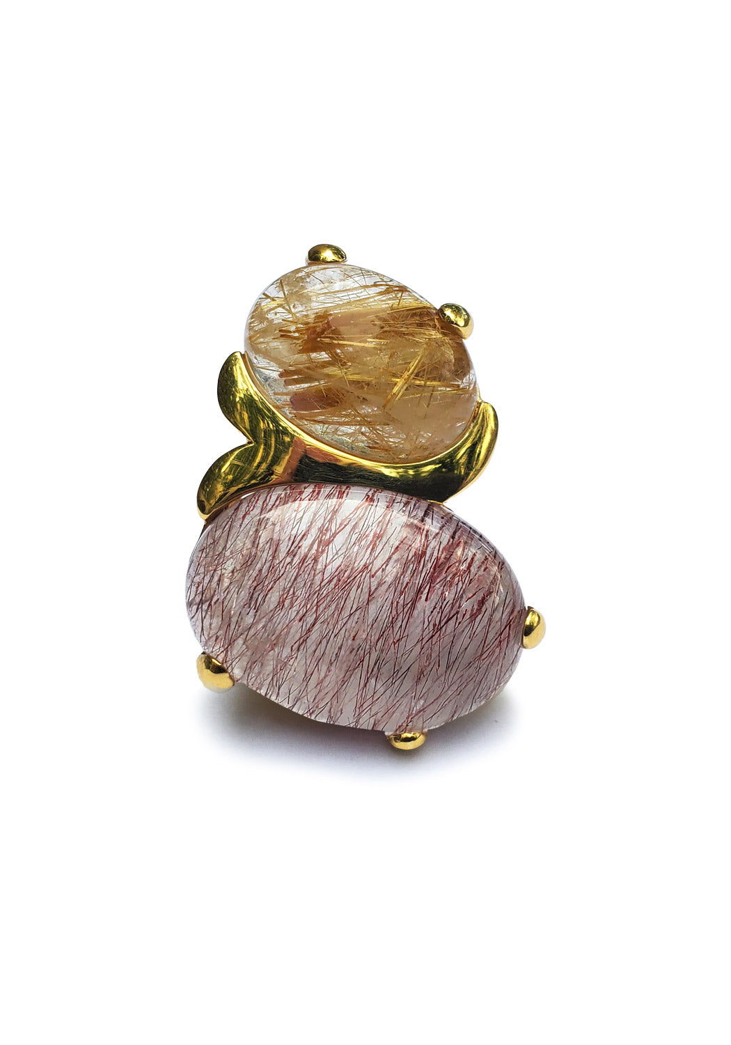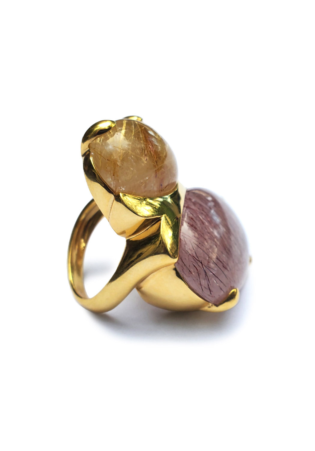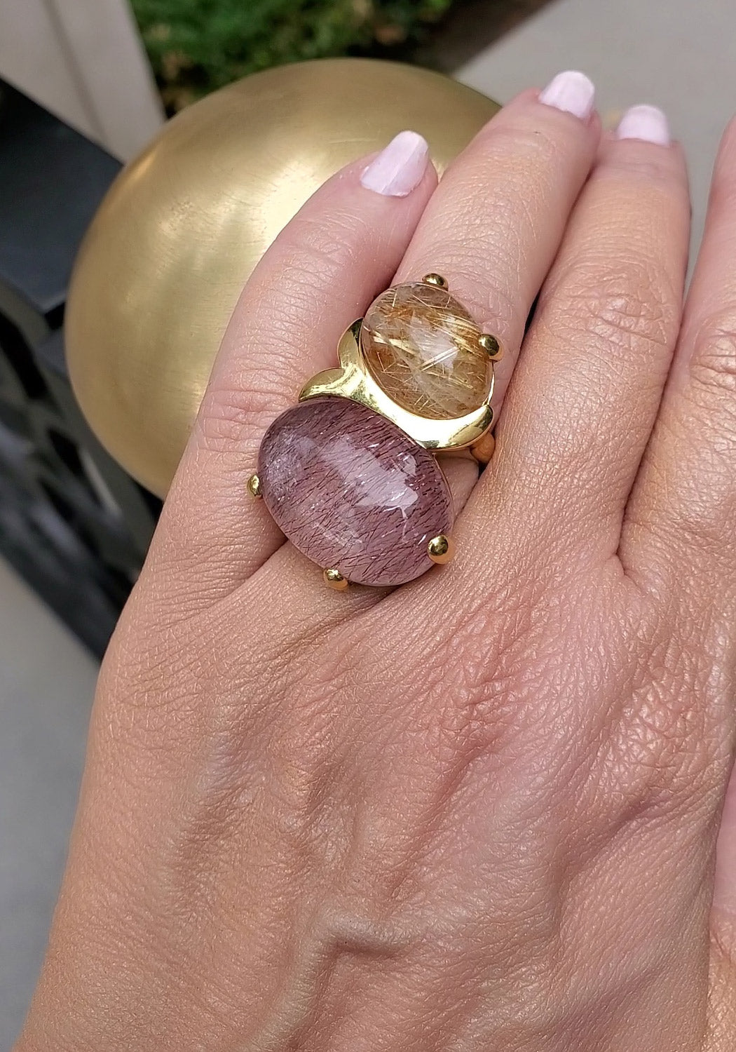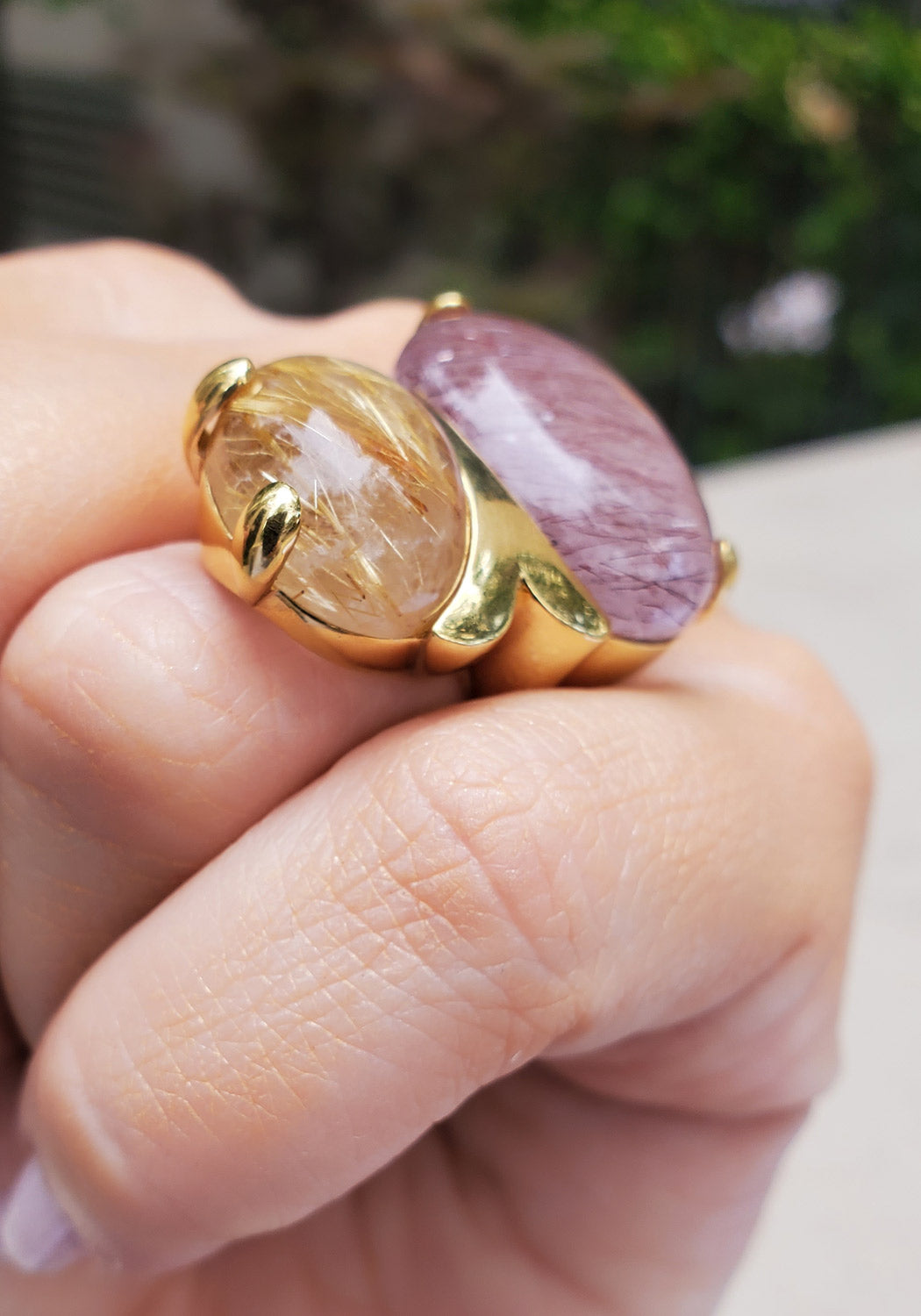 This modern oval shaped ring by Italian designer Marco Molinario features a generous duo of rose and amber rutilated quartz set in 18K yellow gold. Rutilated quartz has been thought to elevate the spirit and illuminate the soul. The ring is 1.25" in length and a size 6-1/4.