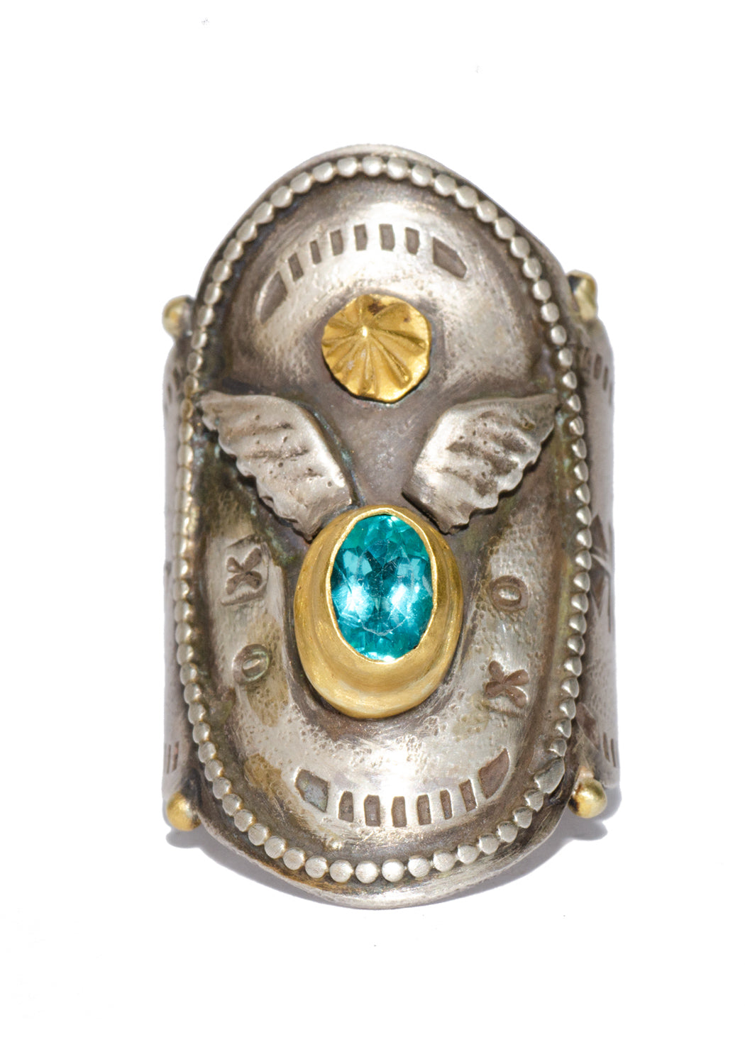 The vibrant blues of the brightest of apatites stands out against 22k yellow gold and sterling silver on this unique saddle ring by Melinda Risk. A stone of motivation, the vibrant apatite is whisked away by the detailed wings. Above it, a 22k yellow gold sand dollar brings good fortune.