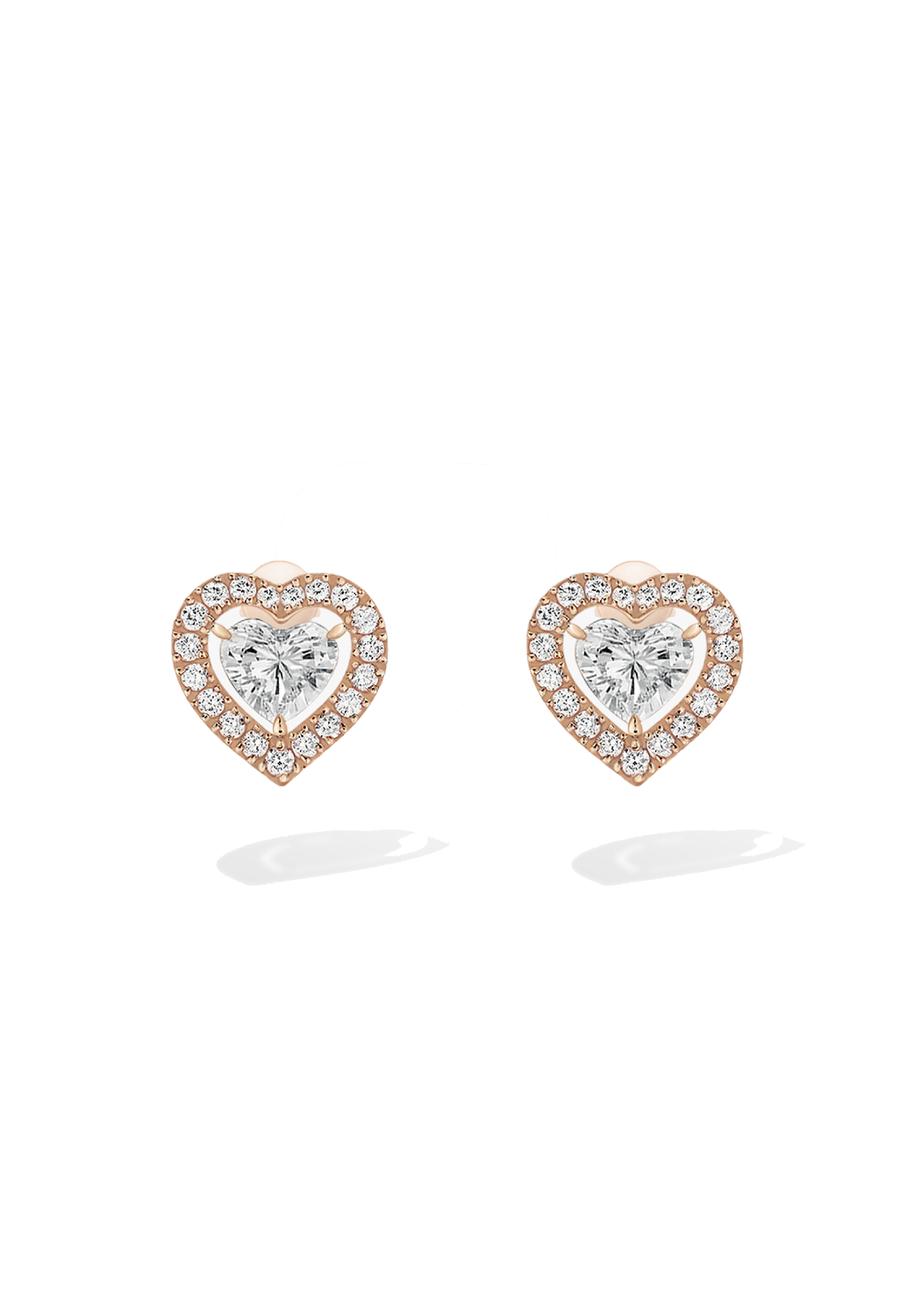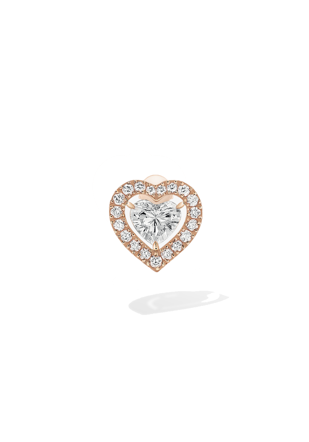 The Messika Joy Cœur 18KRG Diamond Heart Earrings show off exquisite heart shaped diamonds framed by a halo of sparkle. From its inception, the Messika luxury jewelry Maison has dedicated its craftsmanship to the diamond, revered as the Queen of gemstones. The heart cut, a seldom-seen choice, is showcased in this exquisite 0.15-carat diamond stud earring made of luxurious pink gold. The elegant contours of the pink gold diamond earring are highlighted by a fine halo of sparkling brilliant-cut diamonds. This unique pink gold diamond stud earring is available solo, or sold as a pair.