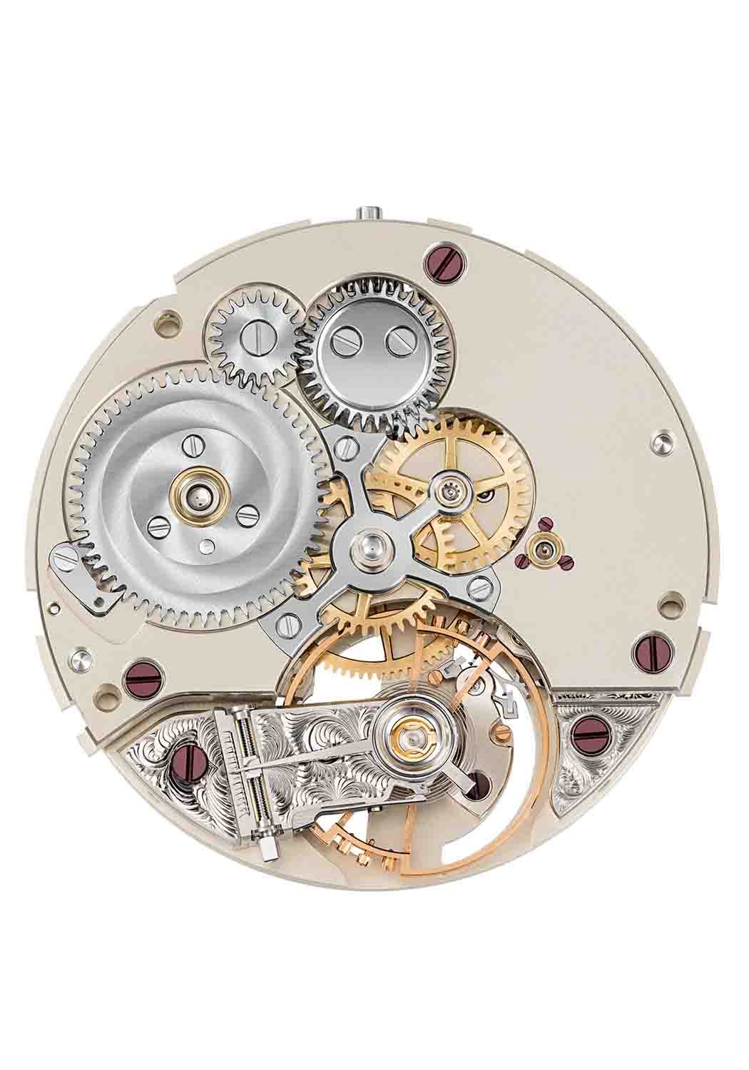 Both the design and construction of the balance cock and escape-wheel cock were adapted to the larger dimensions of the 3/4 plate. The escapement wheel and the cantilevered balance cock with its hand-engraved, floral pattern create a balanced accent in the overall arrangement of the movement. The High-Artistic finish showcases attractive hand engravings, bevels, and chamfers.
