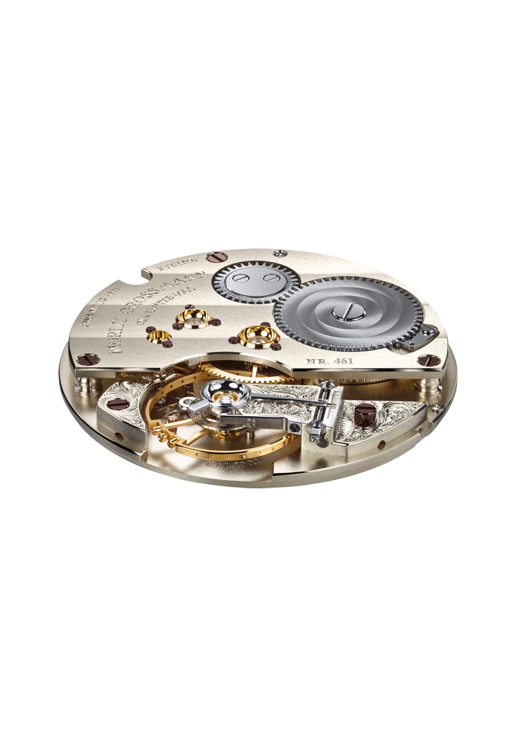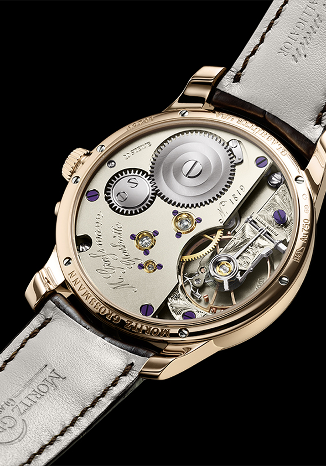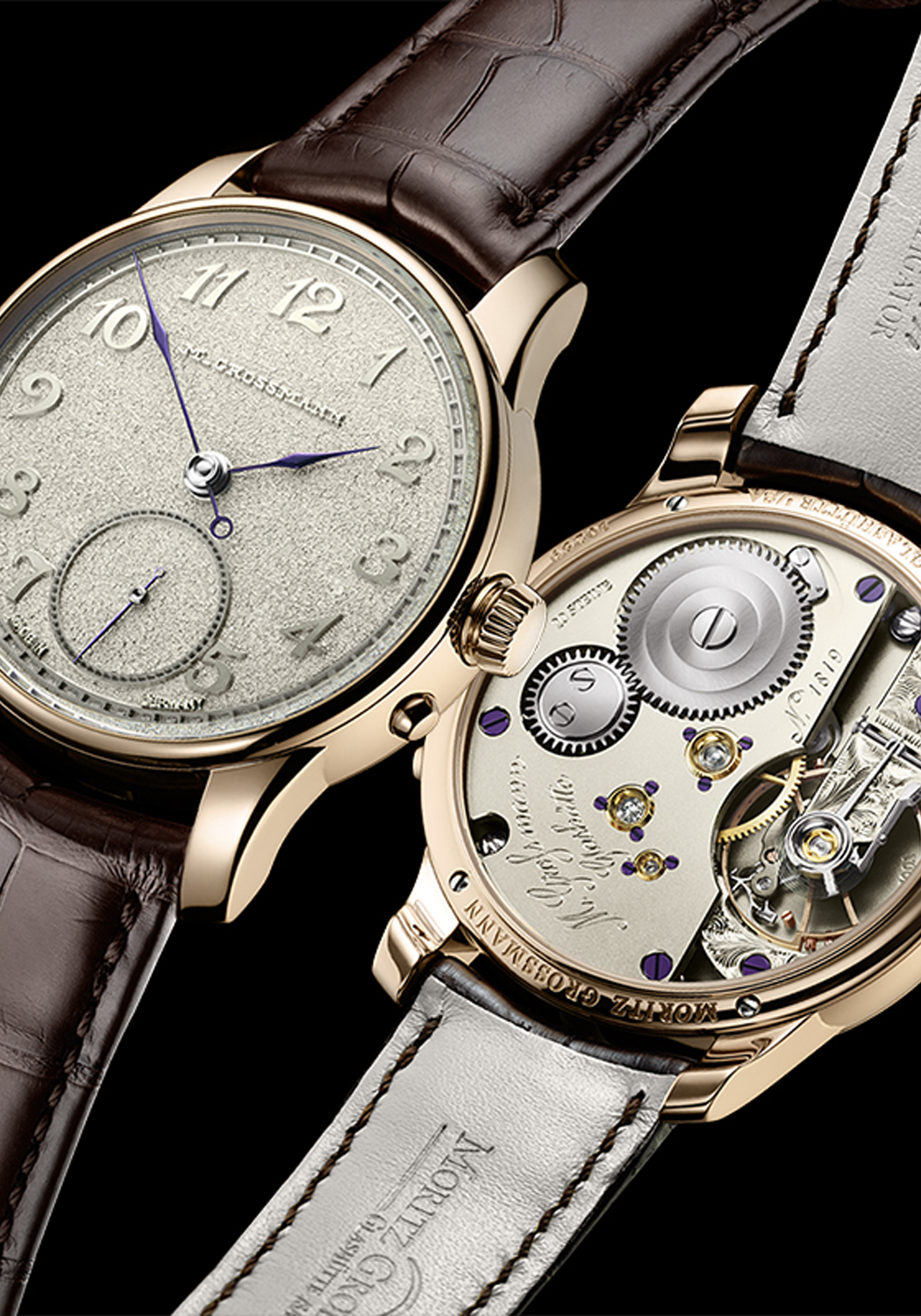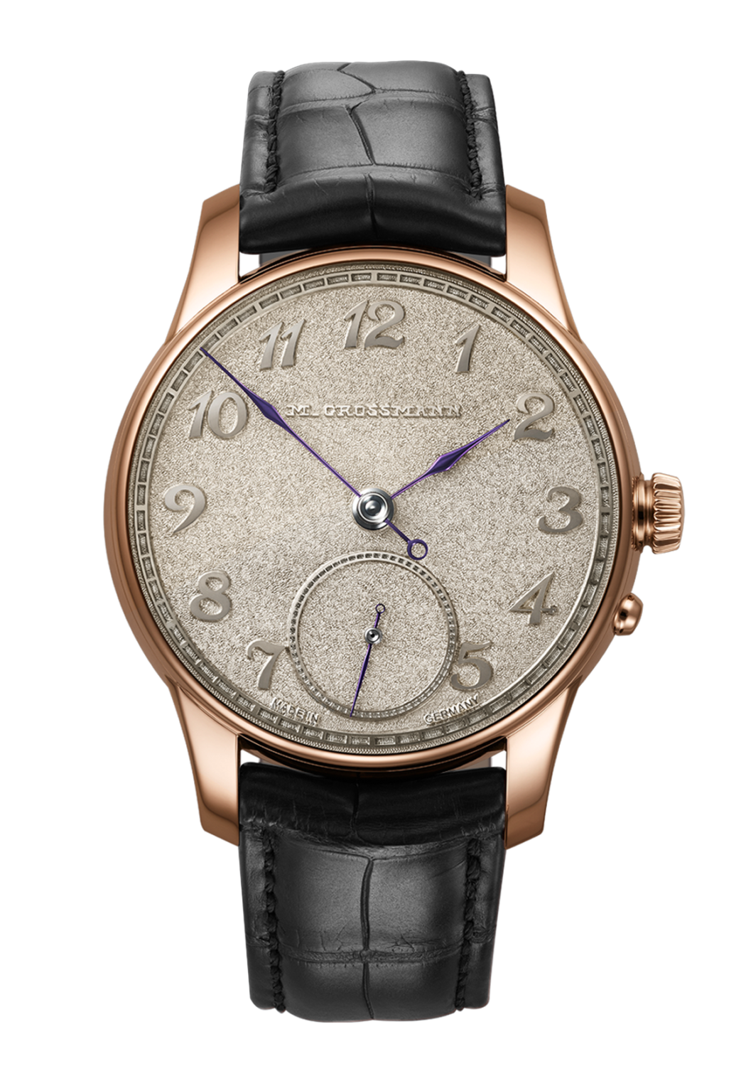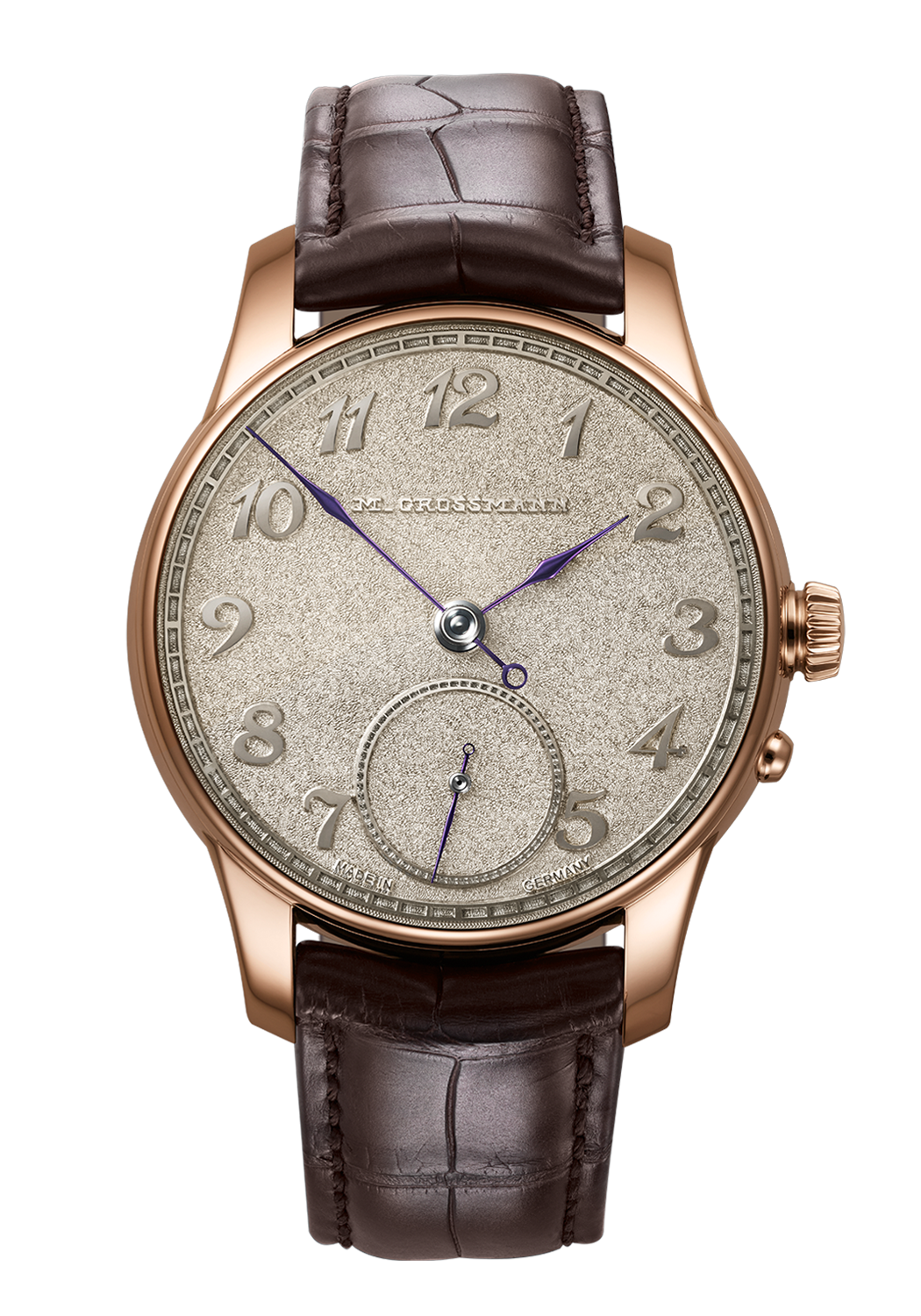 Material and surface form a fascinating liaison. German silver is an alloy of copper, nickel and zinc, among others, which is frequently used in historical watches and movements. Thanks to the surface treatment, this alloy produces a silver-like hue with an aesthetic vintage look. The three-dimensional appearance of the dial underscores the effect: The numerals of the hours and circular small seconds rise above the surface, as does the historic “M. Grossmann” logo from 1875, which goes back to Moritz Grossmann, the famous watchmaking pioneer who gave his name to the Glashütte manufactory.