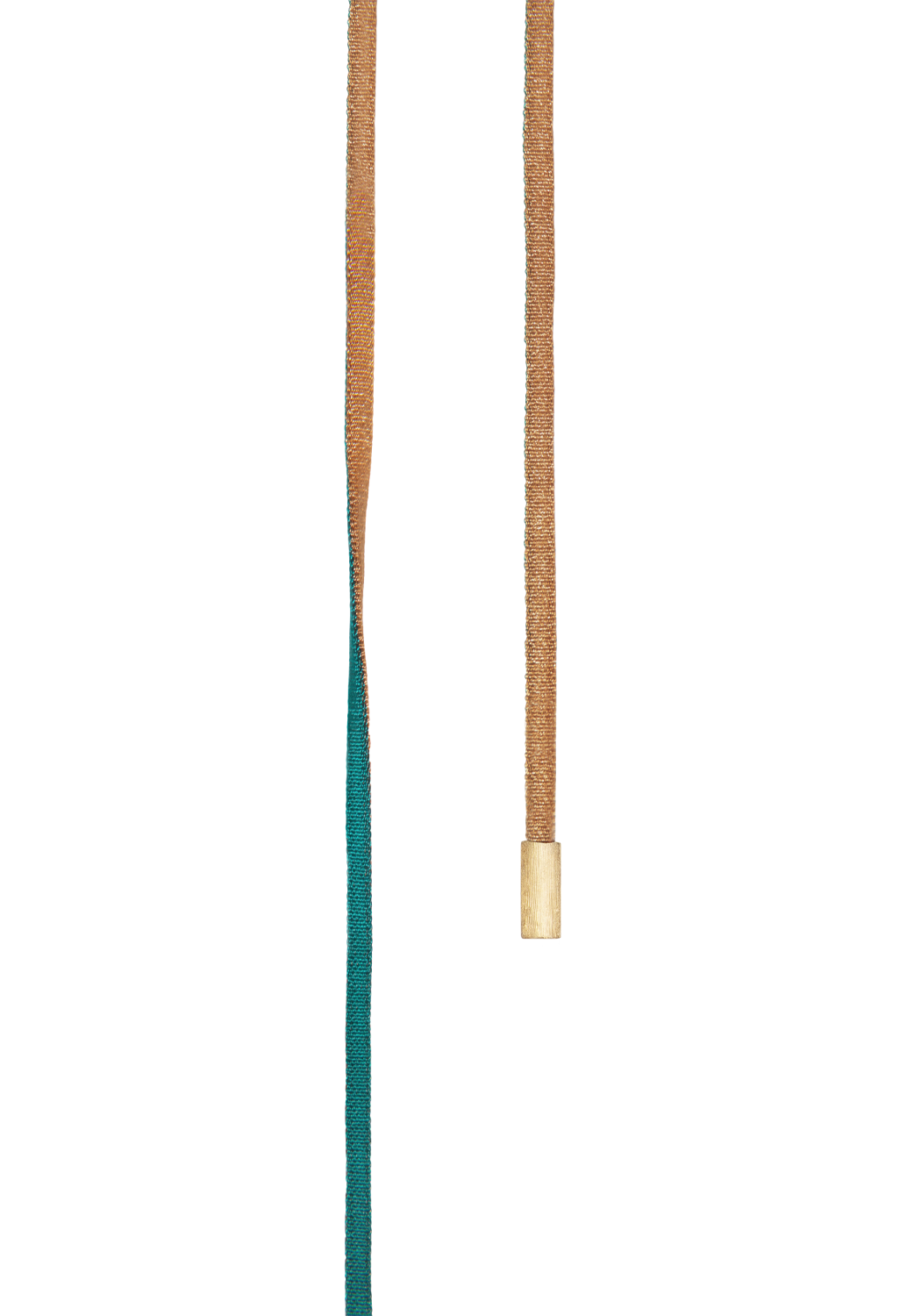 Designed by Charlotte Lynggaard, the silk String necklace is crafted from pure silk with 18 karat, textured, yellow gold end pieces. One side is a golden color, and the other is turquoise. Total length is 51" (130 cm). Layer it with pendants and charms to build a unique pendant necklace or wrap around the wrist as a charm bracelet.