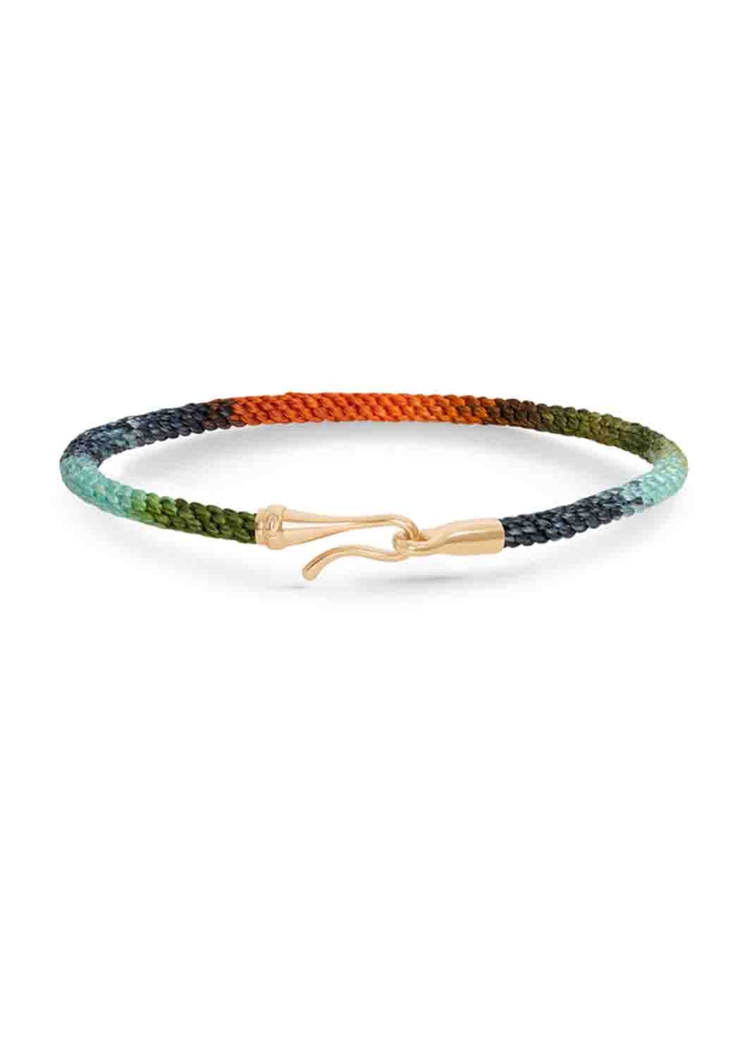 The Ole Lynggaard Tropic themed hand knotted rope bracelet features a hook and lock made of polished 18K yellow gold. A bold color gradient goes from sea greens into deep blues and orange.