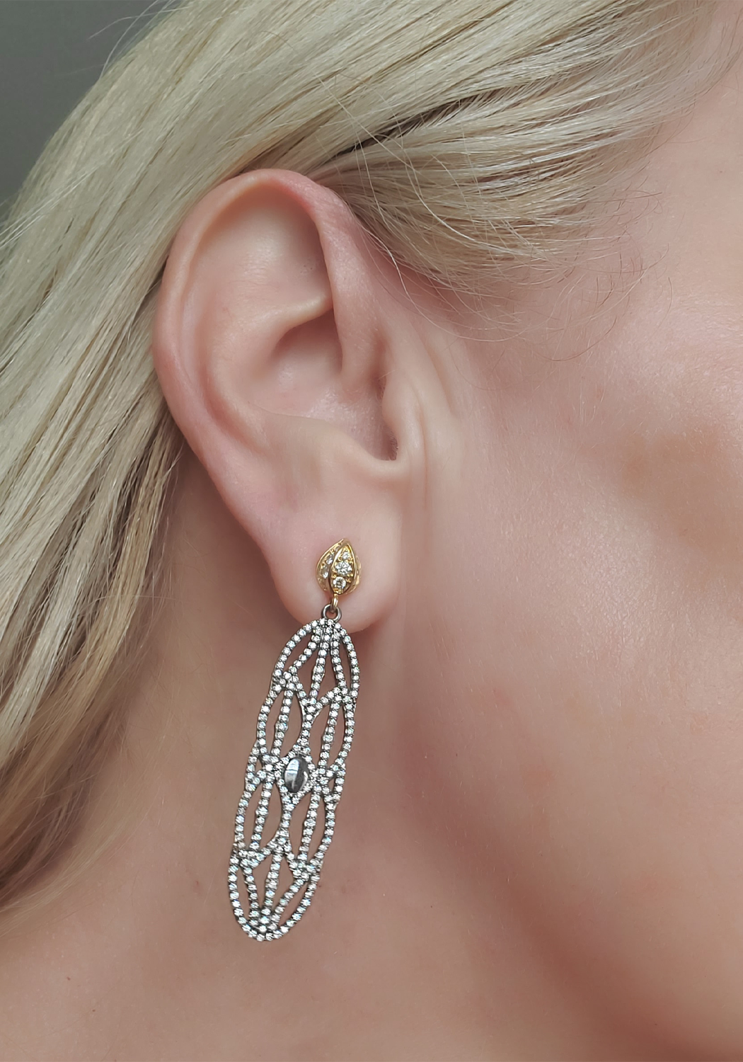 Perfect for sophisticated galas, red carpet events, or any moment you wish to make a bold statement, these earrings are a testament to exquisite craftsmanship and innovative design. Their unique blend of materials and textures, combined with the brilliance of diamonds, makes them a must-have accessory for those who appreciate jewelry that transcends the ordinary, offering an unforgettable accent to any elegant ensemble.