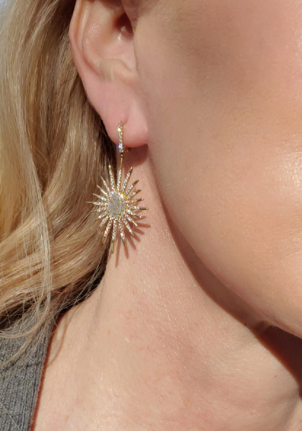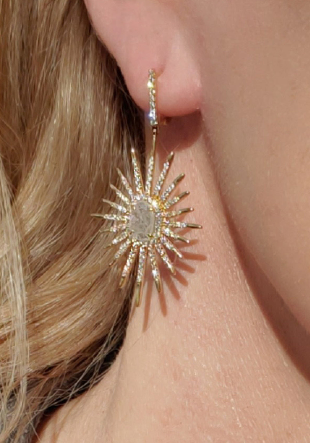The Oster Collection 18K Yellow Gold Starburst Dangle Earrings offer a breathtaking fusion of brilliance and bold design. A dramatic asymmetrical slice of grey diamond takes center stage, surrounded by a radiant burst of pavé-set white diamonds that shimmer with celestial energy. These earrings reimagine classic elegance with a modern, artistic twist.