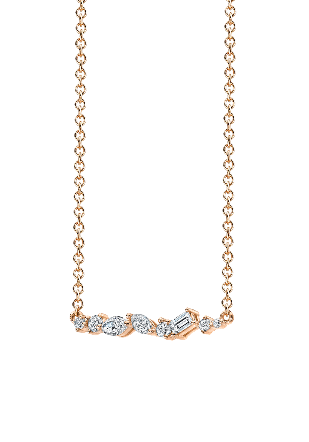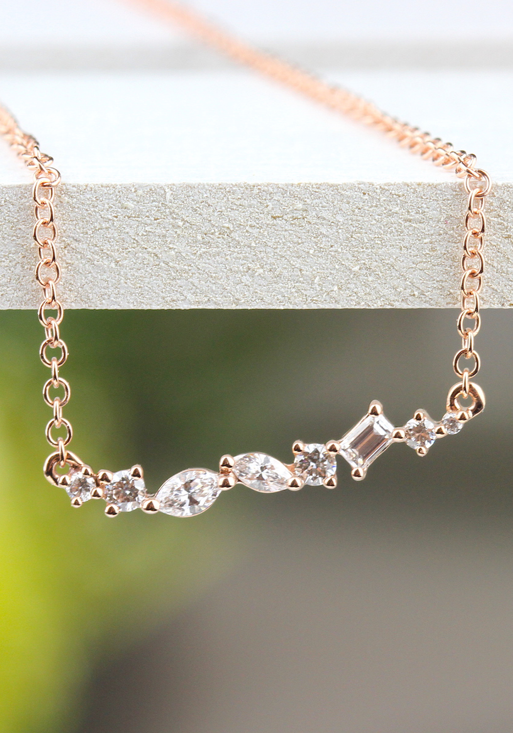 A medley of emerald cut, marquise, and round diamonds shine together in a row on this stunning 18k rose gold Asymmetrical 8 Diamond Bar Necklace. Made with high-quality 18K rose gold, this necklace features an organic design adorned with 8 dazzling diamonds and adds a touch of sophistication and glamour to any outfit.