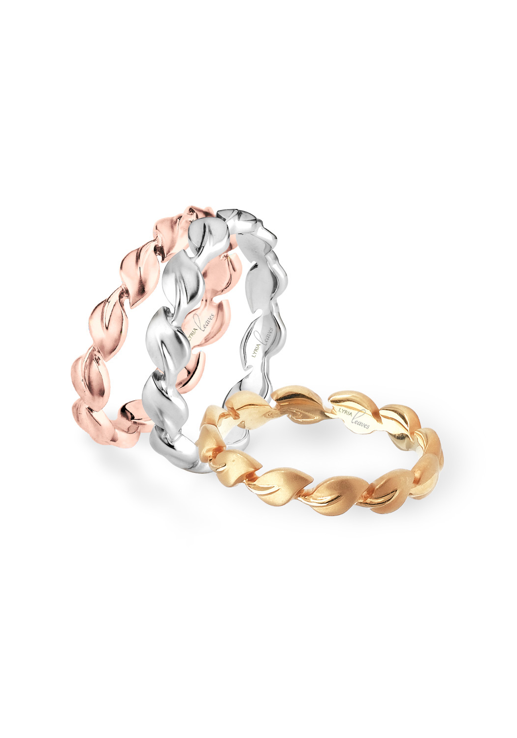Satin finished cascading leaves in glowing 18k rose gold form this graceful, bestselling band design- which was also featured in The Vow, starring Rachel McAdams! Beautiful as a single band, yet a fabulously complementary stacking ring, this style from the Lyria Collection is eternally stylish. Seen in BRIDES magazine’s “The Edit: 9 Favorite Bands” story! Also available in 18k yellow gold.