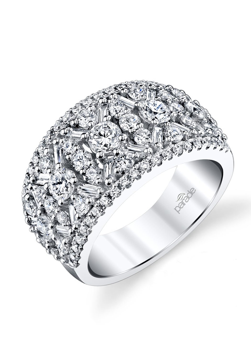 Bold and beautiful, this showstopper of a ring shows off fabulous baguette and round diamonds in a dynamic display of sparkle. This wider ring is perfect for those that want a fiery and fabulous accessory for any memorable occasion.
