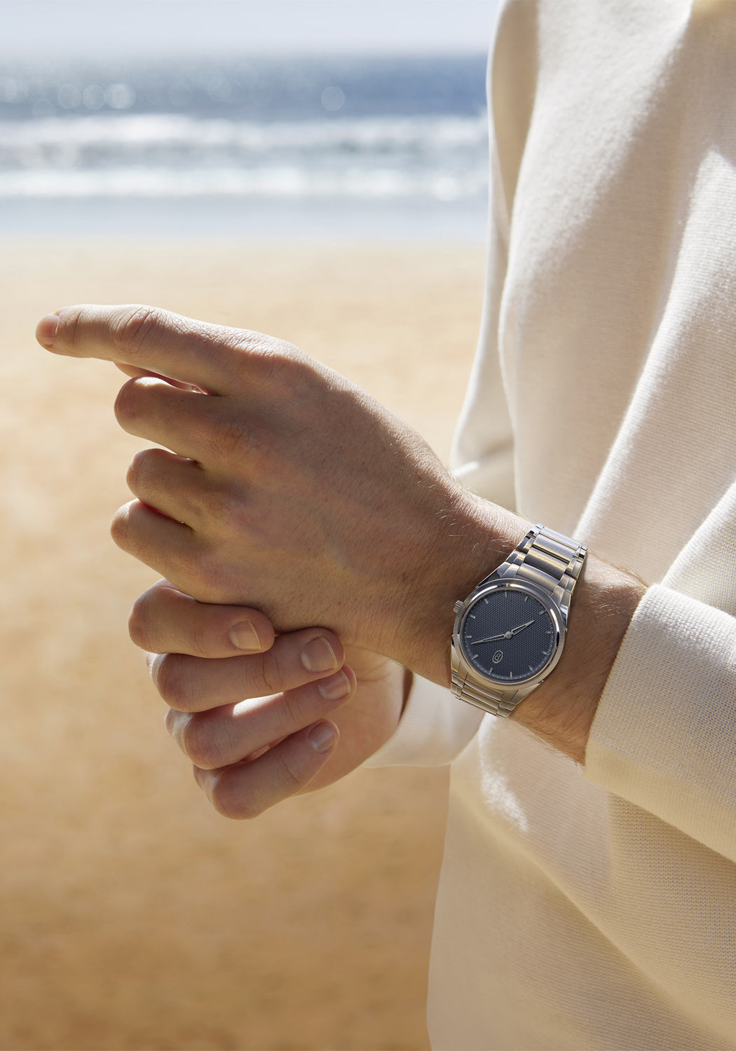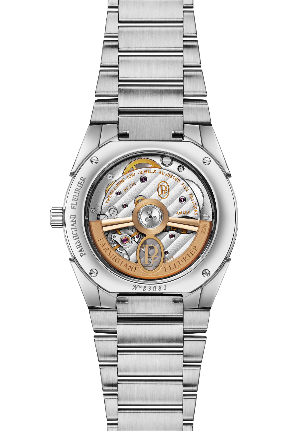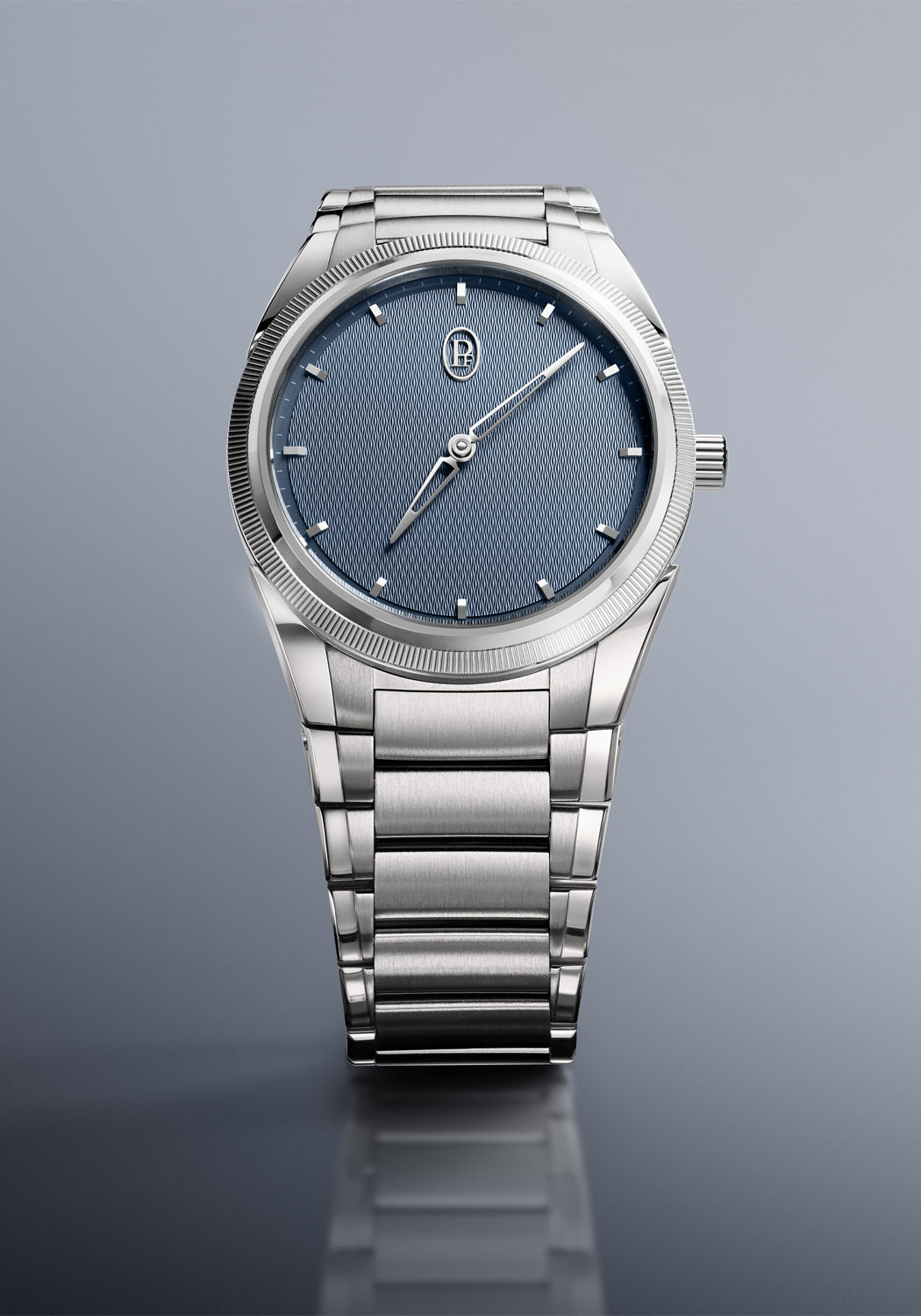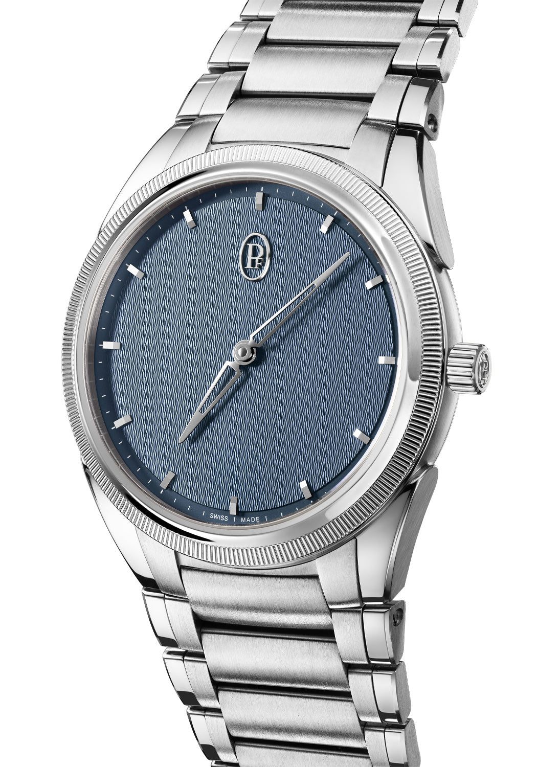 The Stone Blue dial of the Parmigiani Fleurier Tonda PF 36MM showcases exceptional artisanal craftsmanship, featuring a finely guilloché Grain d’Orge motif that plays with light to reveal ever-changing reflections. This mesmerizing dial is framed by the signature knurled platinum bezel, seamlessly complementing the stainless steel case—a defining hallmark of the Tonda PF collection. Hand-applied rhodium-plated gold indexes add an extra layer of refinement, striking the perfect balance between minimalist elegance and intricate detailing. A masterpiece of understated luxury, the Tonda PF 36MM embodies timeless sophistication with every glance.