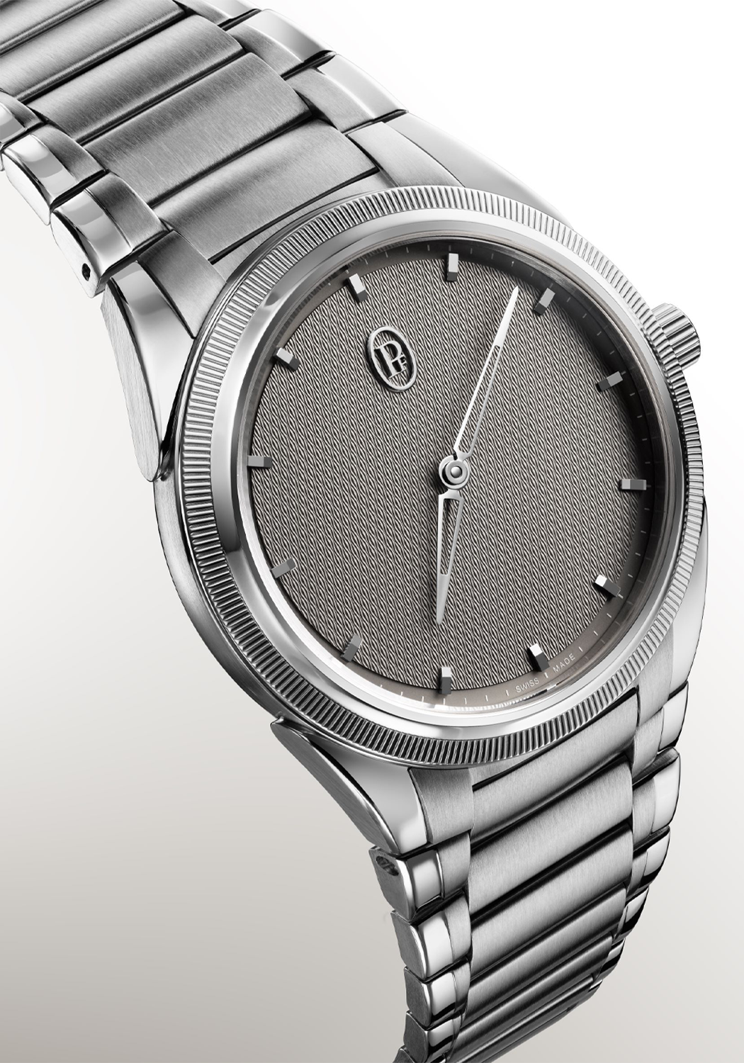 The latest generation of the Tonda PF Automatic proudly upholds the stylistic codes that Parmigiani Fleurier so deftly established for its predecessor: fluid and harmonious integration of the case and bracelet in 18ct rose gold or steel, knurled bezel, and finely guilloché minimalist dials with baguette-cut diamond hour markers set invisibly. Three new colour variations debut to mark the transition to this new format: Silver Sand and Warm Grey for the steel versions with a platinum bezel and Deep Ruby for the full 18-ct rose-gold version - sobriety, discreet elegance in line with the chromatic palette favoured by Parmigiani Fleurier.