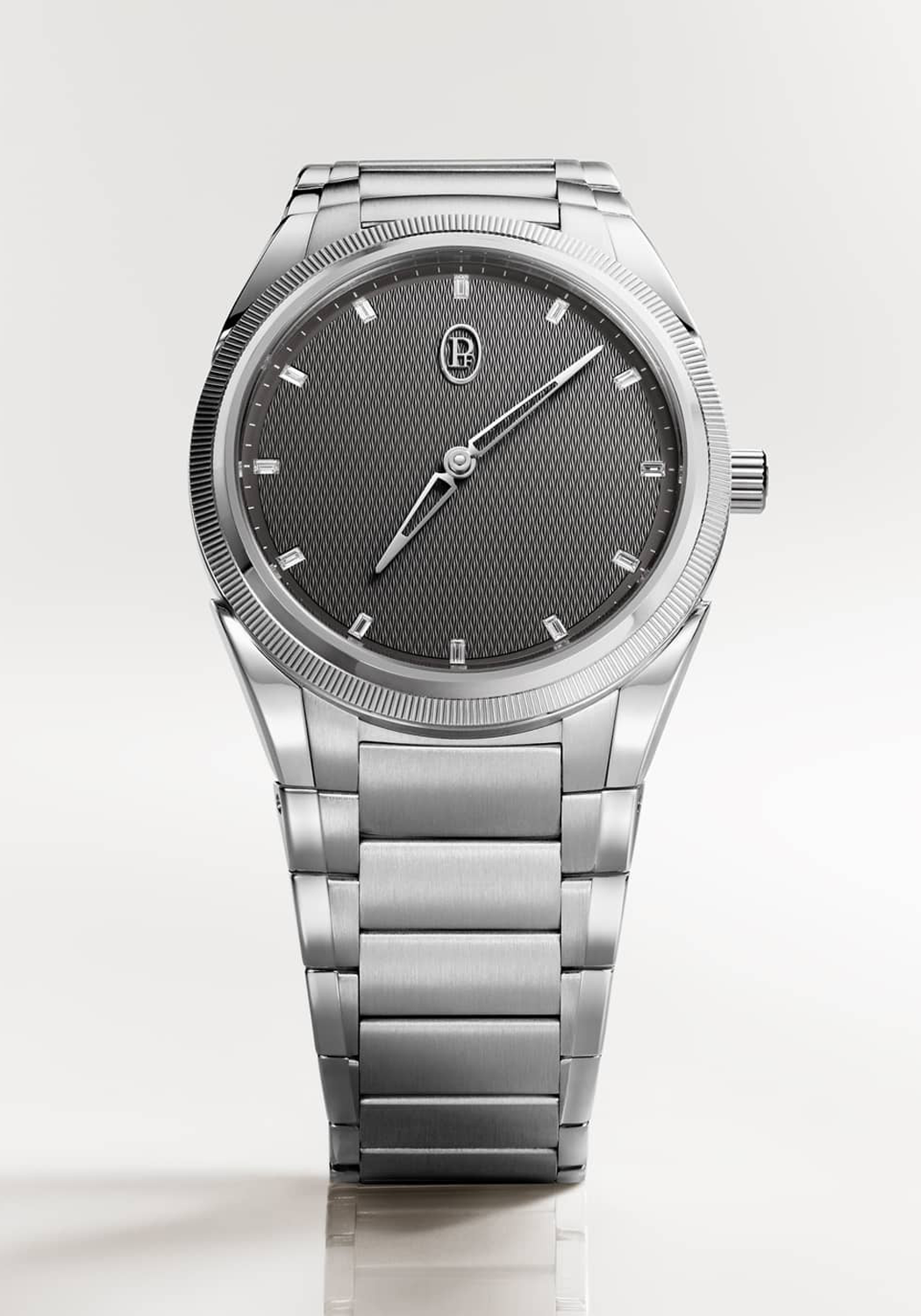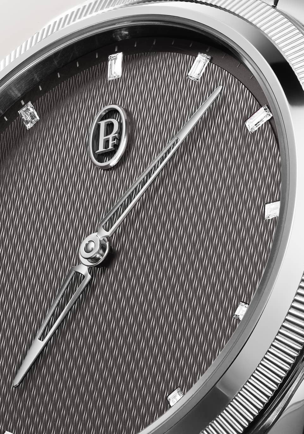 The latest generation of the Tonda PF Automatic proudly upholds the stylistic codes that Parmigiani Fleurier so deftly established for its predecessor: fluid and harmonious integration of the case and bracelet in steel, knurled bezel, and finely guilloché minimalist dials with baguette-cut diamond hour markers set invisibly.