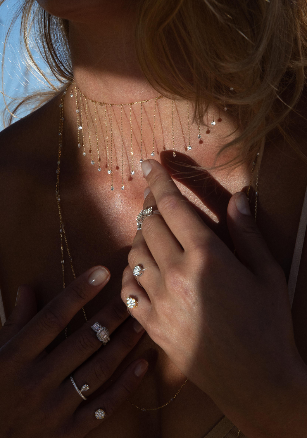 The floating diamond ring, an iconic design from the mind of Persée Paris, creates the illusion of sparkling diamonds suspended magically on the skin. This technique is made possible by the use of a fine nylon cord securing the diamonds magically in place. On this version, eight diamonds come together to create a flattering pear shape. It is recommended to go up two ring sizes when ordering. Available in stock in size 51 mm.