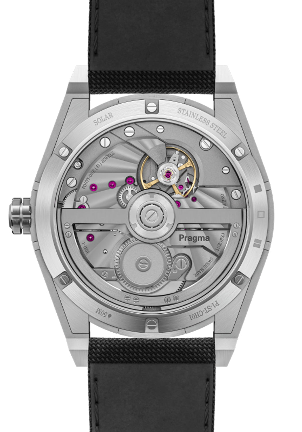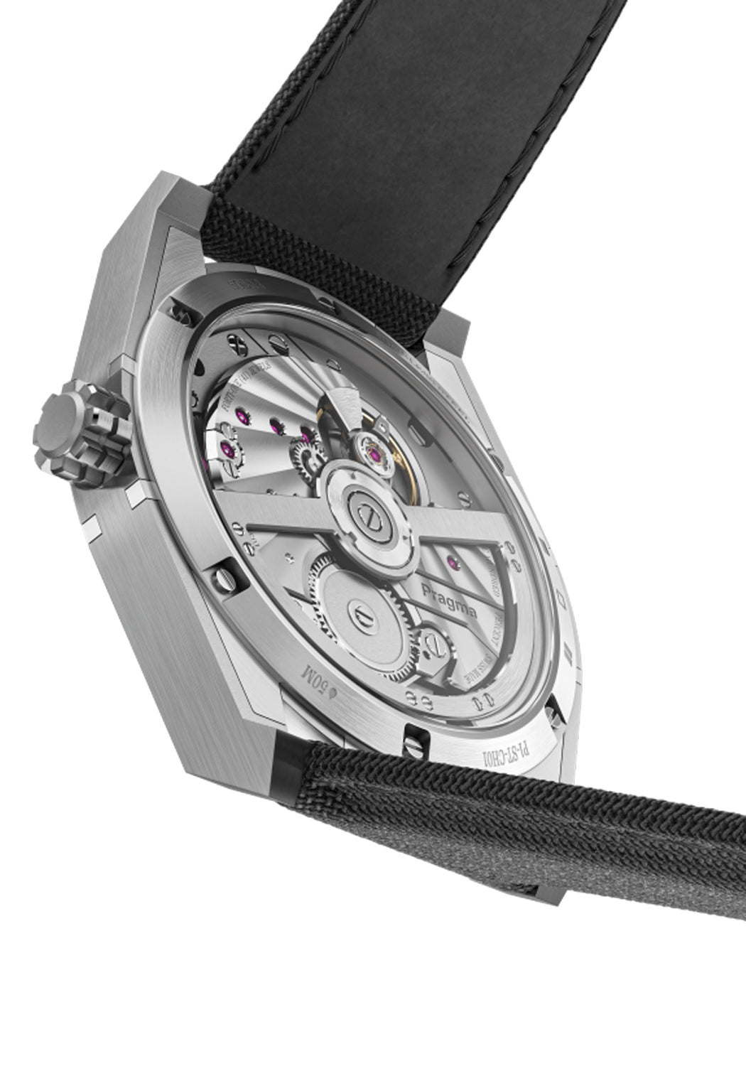 Inside, the Pragma Caliber 1031-1 powers the watch—a Swiss-made automatic chronometer movement certified under ISO 3159 standards for superior precision. It offers hours, minutes, a small seconds disk at 6 o’clock, and a date display at 12 o’clock, with a frequency of 4 Hz and a robust 60-hour power reserve. A variable inertia balance enhances long-term accuracy, while the movement’s bridges and plates are constructed from 100% recycled titanium, underscoring Pragma’s commitment to sustainable innovation.