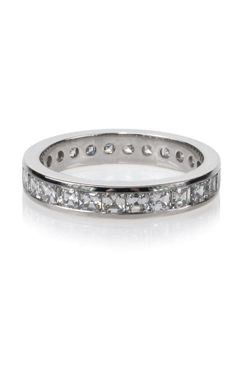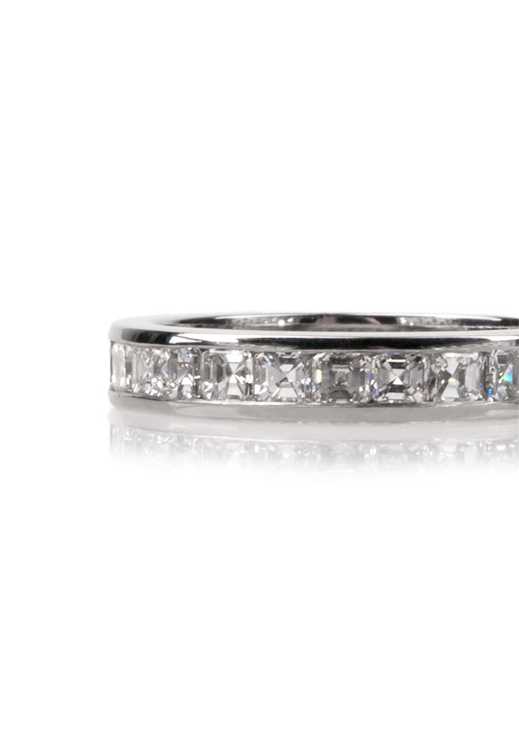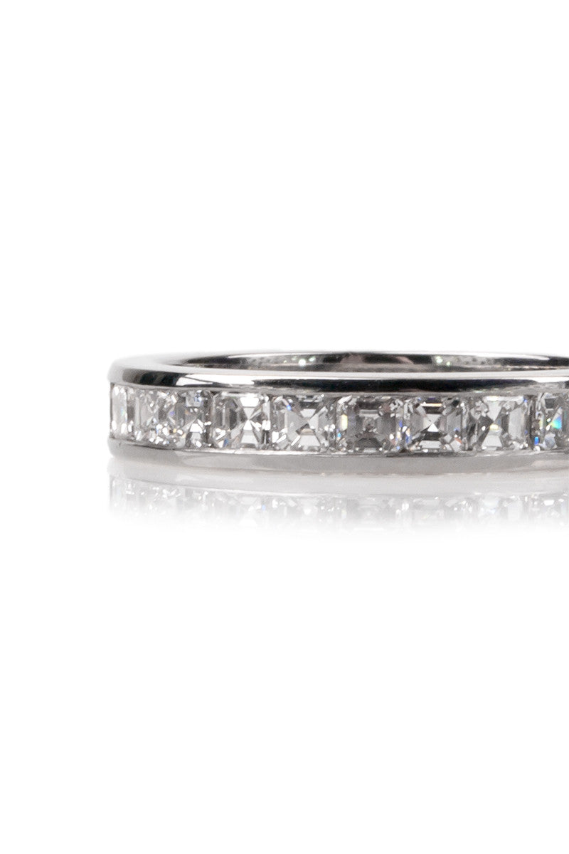 The Precision Set Platinum Emerald Cut Diamond Eternity Band is a remarkable piece that epitomizes luxury and sophistication. Expertly crafted in platinum, this size 6 eternity band is adorned with 1.80 carats total weight of perfectly matched emerald cut diamonds. Each diamond is meticulously selected to ensure uniformity and brilliance, creating a seamless and dazzling display around the entire band. This exquisite ring is a perfect symbol of everlasting love, offering a timeless elegance that will be cherished for a lifetime. Ideal for those seeking a refined and luxurious addition to their jewelry collection, this platinum eternity band is truly a masterpiece.