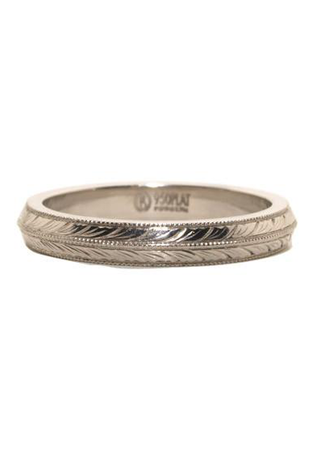 The Precision Set Platinum Knife-Edge Engraved Band is a testament to timeless craftsmanship and elegance. This exquisite platinum wedding band, measuring 3mm in width, is meticulously hand-engraved to create a stunningly detailed design.