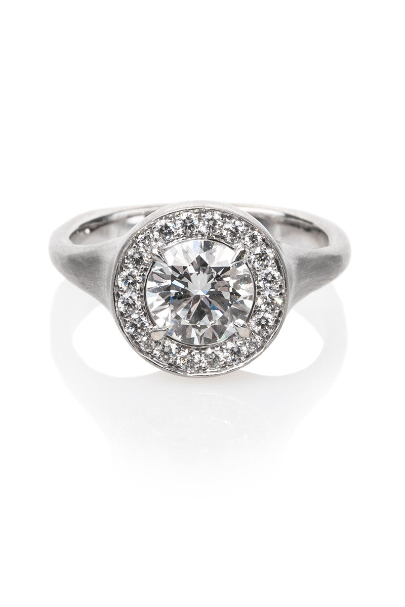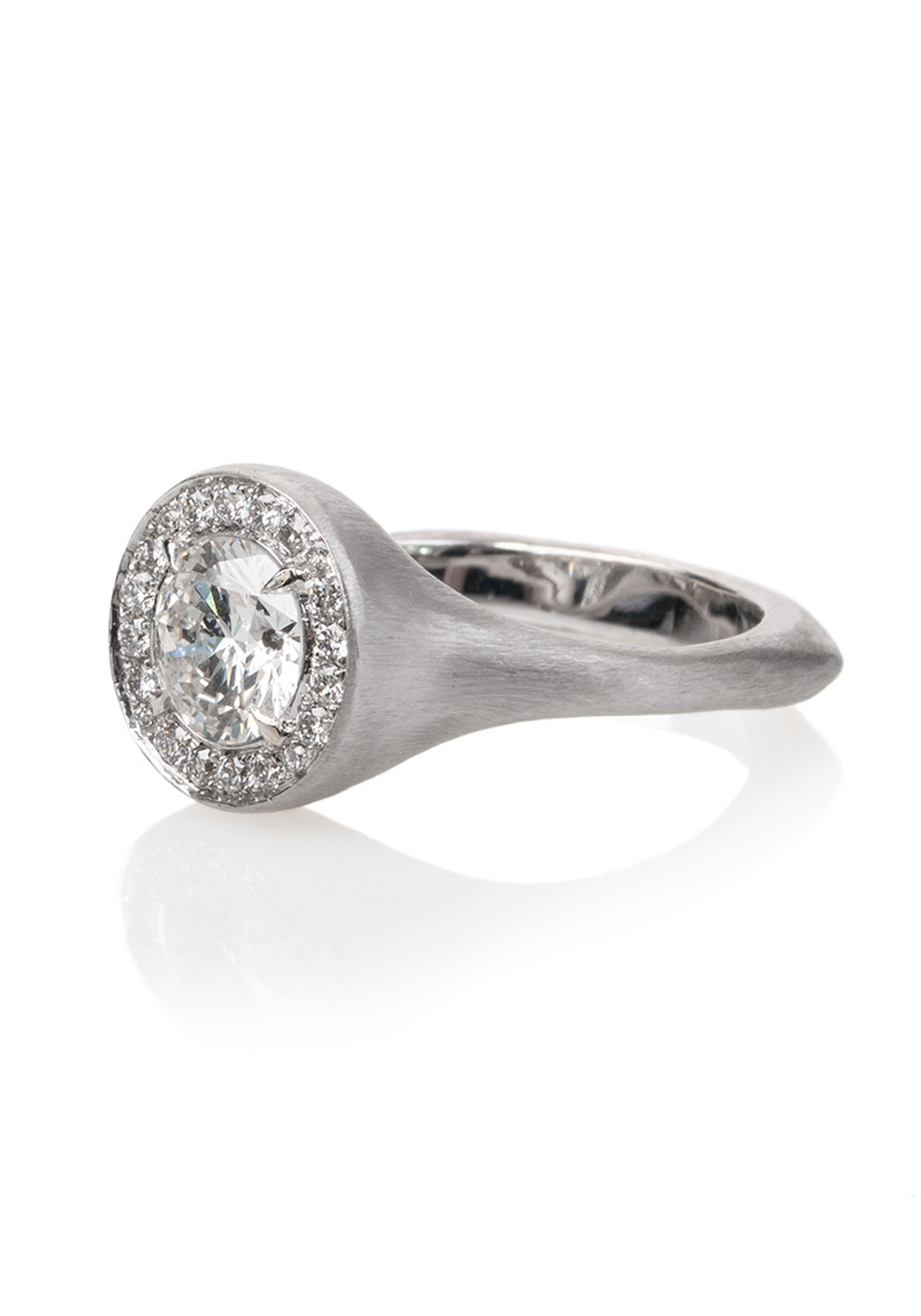 The Rahaminov Diamond Ring is an exquisite blend of elegance and craftsmanship. Featuring a stunning 1.04ct round diamond with a GIA grading of G/SI2, this ring is a true masterpiece. The central diamond is beautifully showcased in a .21ctw diamond bezel, enhancing its brilliance and allure. Crafted from brushed 18k white gold, this ring boasts a unique squared shank, adding a modern twist to its classic design. Available in size 6-1/2, this luxurious piece is perfect for those seeking a distinctive and sophisticated addition to their jewelry collection.
