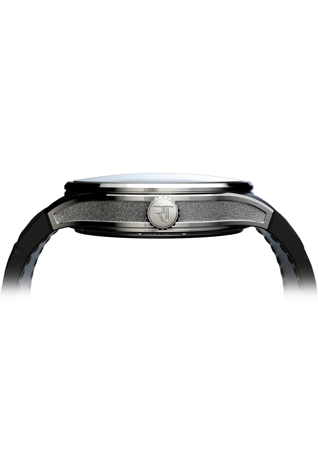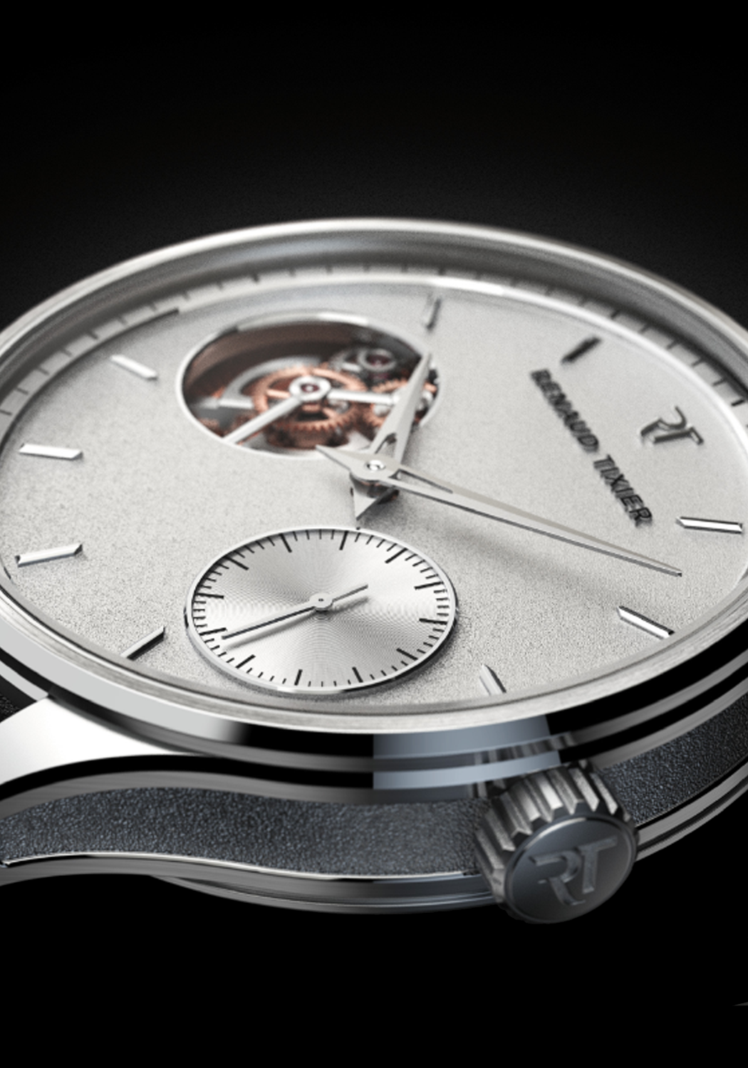 The "Monday" embodies the first of seven fundamental horological innovations conceived by Renaud Tixier. Its design, inspired by neo-classical architecture, is both sober and elegant, emphasizing purity in form. The dial showcases this simplicity and refinement, highlighting the timepiece's groundbreaking innovation. An open view of the flywheel at nine o'clock is beautifully balanced by a small seconds display at four o'clock.