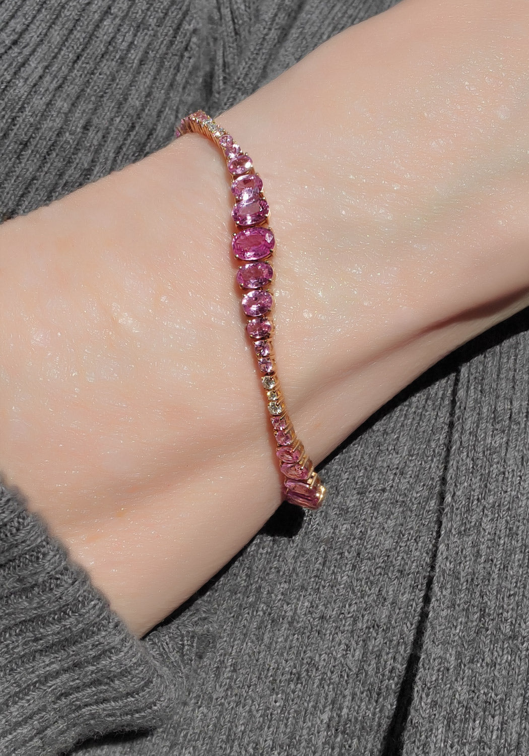 The Ruchi 18K Rose Gold Ombré Pink Sapphire Tennis Bracelet captivates with four waves of graduated pink sapphires flowing into shimmering white diamonds. This striking blend of precious pink sapphires and radiant diamonds creates a beautiful, timeless piece, making it an ideal gift for Valentine’s Day, birthdays, or Mother’s Day.