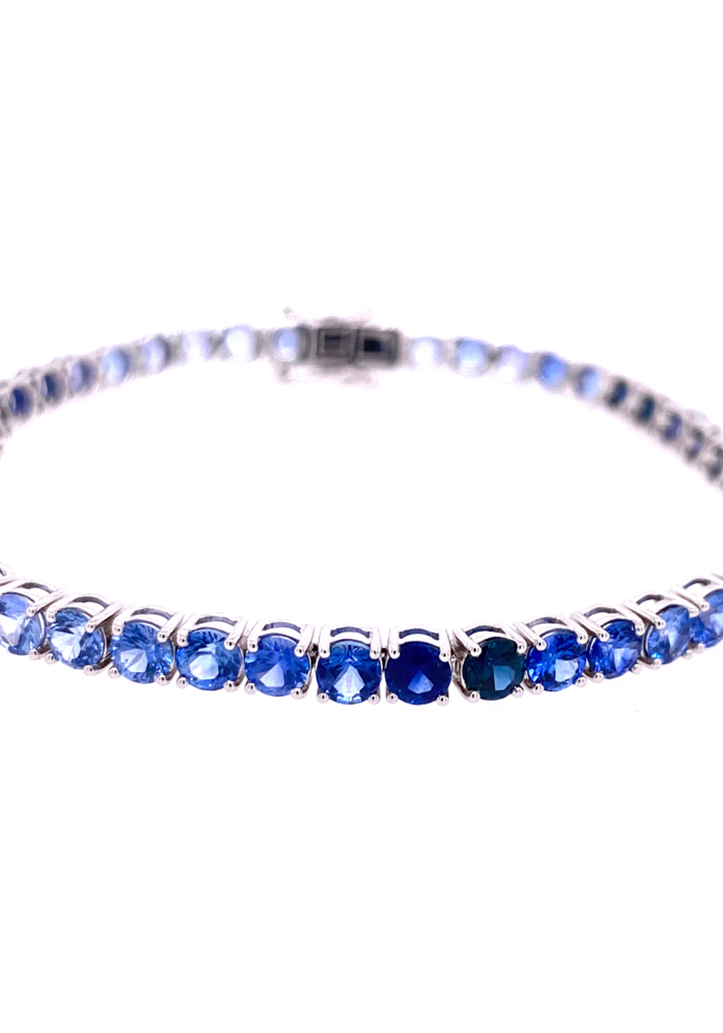 The Ruchi 18K White Gold Ombré Blue Sapphire Tennis Bracelet radiates with an impressive 12.17 carats of sapphires, flowing seamlessly from deep indigo to lighter shades of blue. Designed in luxurious white gold, this piece honors September’s birthstone with a gradient of brilliance that makes an elegant statement on the wrist.