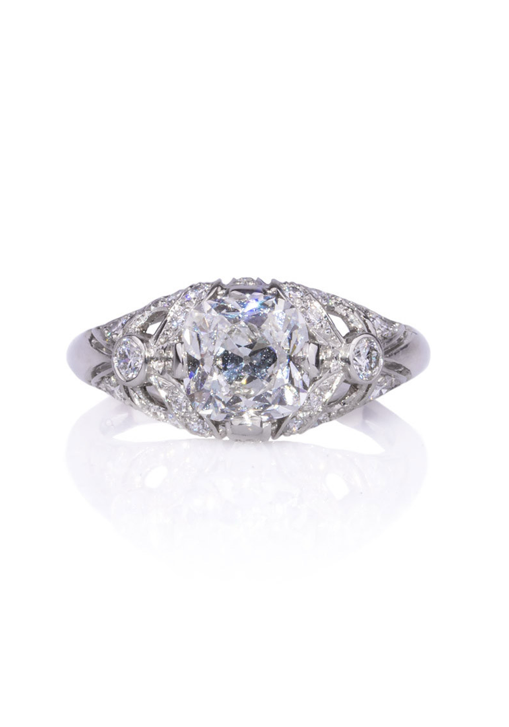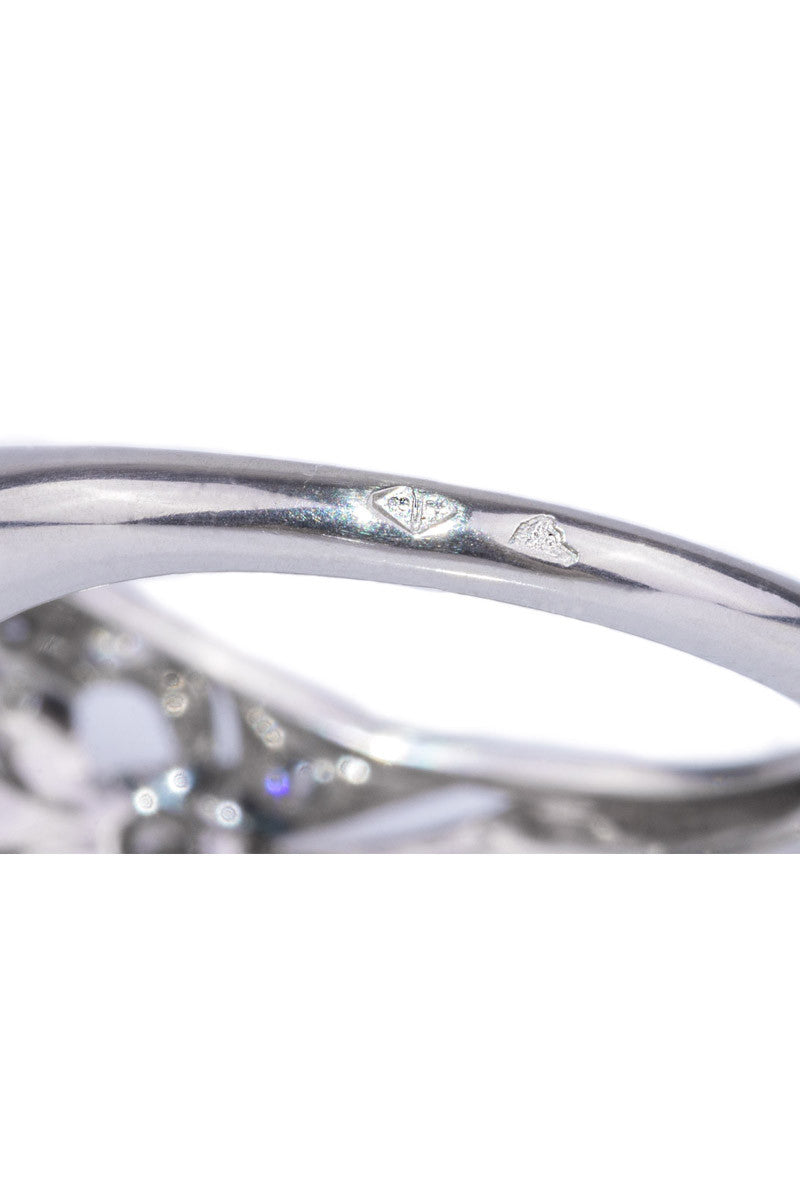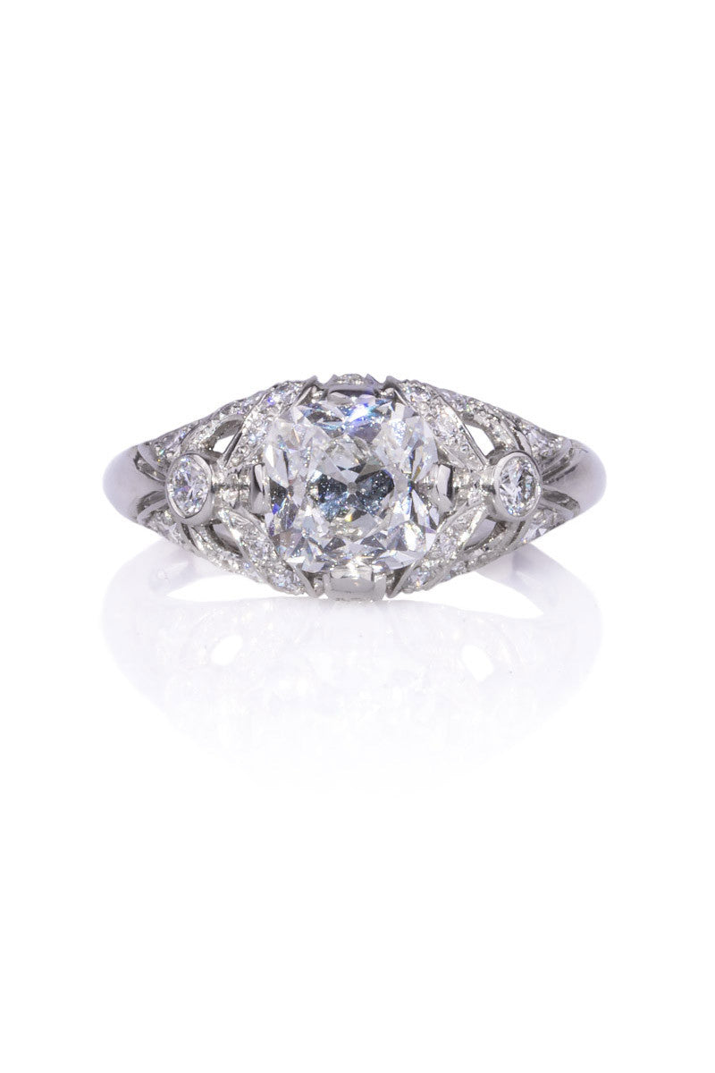 The Sébastien Barier Platinum Cushion Cut Diamond Ring combines vintage charm with modern elegance. This size 5 platinum engagement ring is adorned with .43 carats total weight of pavé diamonds and features a stunning 1.50-carat cushion cut center diamond, GIA graded F/SI1. Expertly designed by Sébastien Barier, the ring showcases an exquisite blend of classic and contemporary aesthetics. The platinum band enhances the brilliance of the diamonds, creating a captivating piece that embodies timeless sophistication. Elevate your engagement with this beautifully crafted diamond ring, a true testament to superior craftsmanship and elegant design. Size 5 (can be resized)