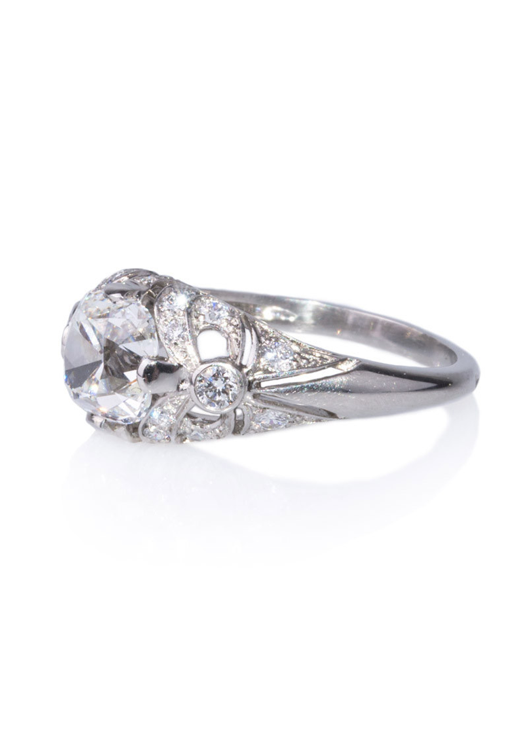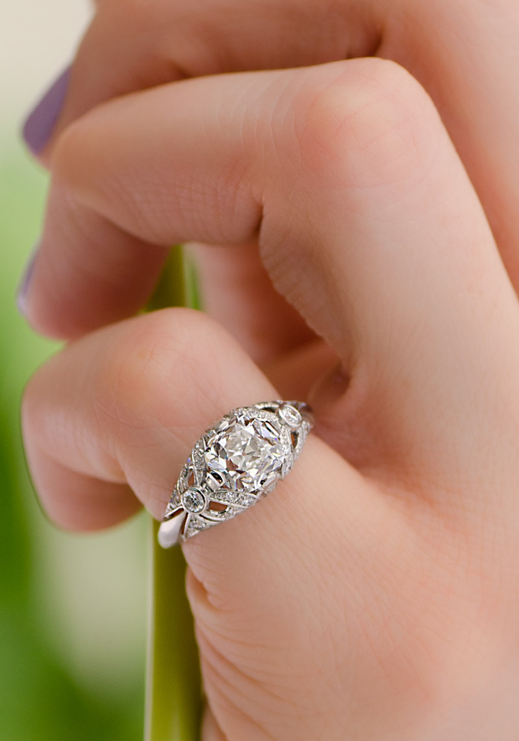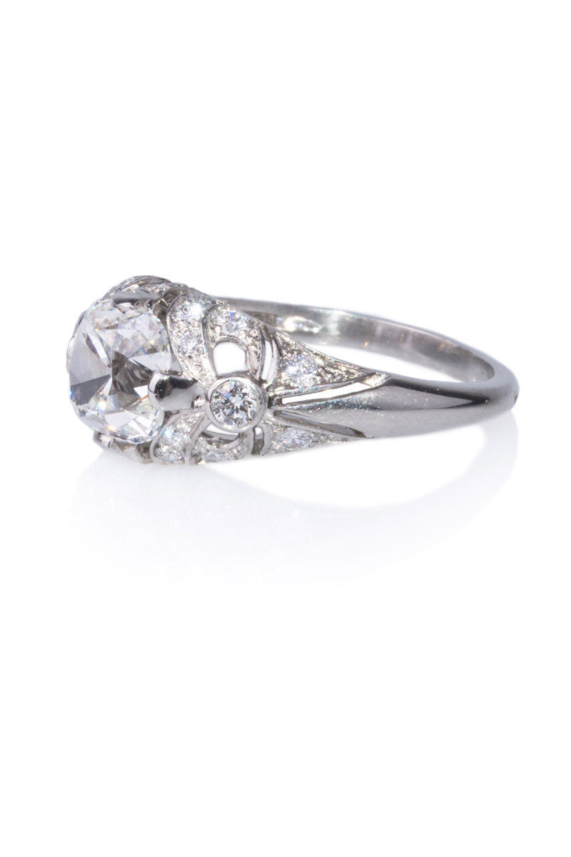 The Sébastien Barier Platinum Cushion Cut Diamond Ring combines vintage charm with modern elegance. This size 5 platinum engagement ring is adorned with .43 carats total weight of pavé diamonds and features a stunning 1.50-carat cushion cut center diamond, GIA graded F/SI1. Expertly designed by Sébastien Barier, the ring showcases an exquisite blend of classic and contemporary aesthetics. The platinum band enhances the brilliance of the diamonds, creating a captivating piece that embodies timeless sophistication. Elevate your engagement with this beautifully crafted diamond ring, a true testament to superior craftsmanship and elegant design. Size 5 (can be resized)