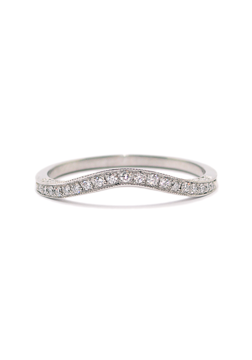 Sébastien Barier's platinum size 6-1/2 curved band is an antique-inspired marvel, adorned with 0.17 carats total weight of diamonds. This exquisite platinum eternity band captures timeless elegance and can be cherished as a wedding ring or a sophisticated accessory. Expertly crafted, the delicate diamond detailing on this curved band showcases Sébastien Barier's commitment to unparalleled quality and design. Whether worn alone or paired with other pieces, this platinum diamond eternity band is a stunning addition to any jewelry collection, offering a blend of classic beauty and modern style.