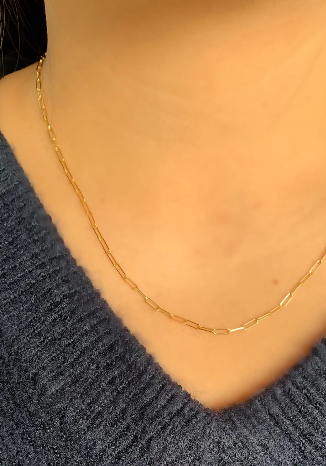 Elevate your jewelry collection with the Sethi Couture 14K Yellow Gold Medium Paperclip Chain Necklace, a refined blend of modern design and timeless elegance. At 18 inches, this versatile piece is stunning on its own for a sleek, minimalist statement or paired with your favorite pendant for a personalized touch. The adjustable links, crafted with thoughtful precision, allow for a custom fit—making it the perfect choice for layering or wearing solo with effortless sophistication.