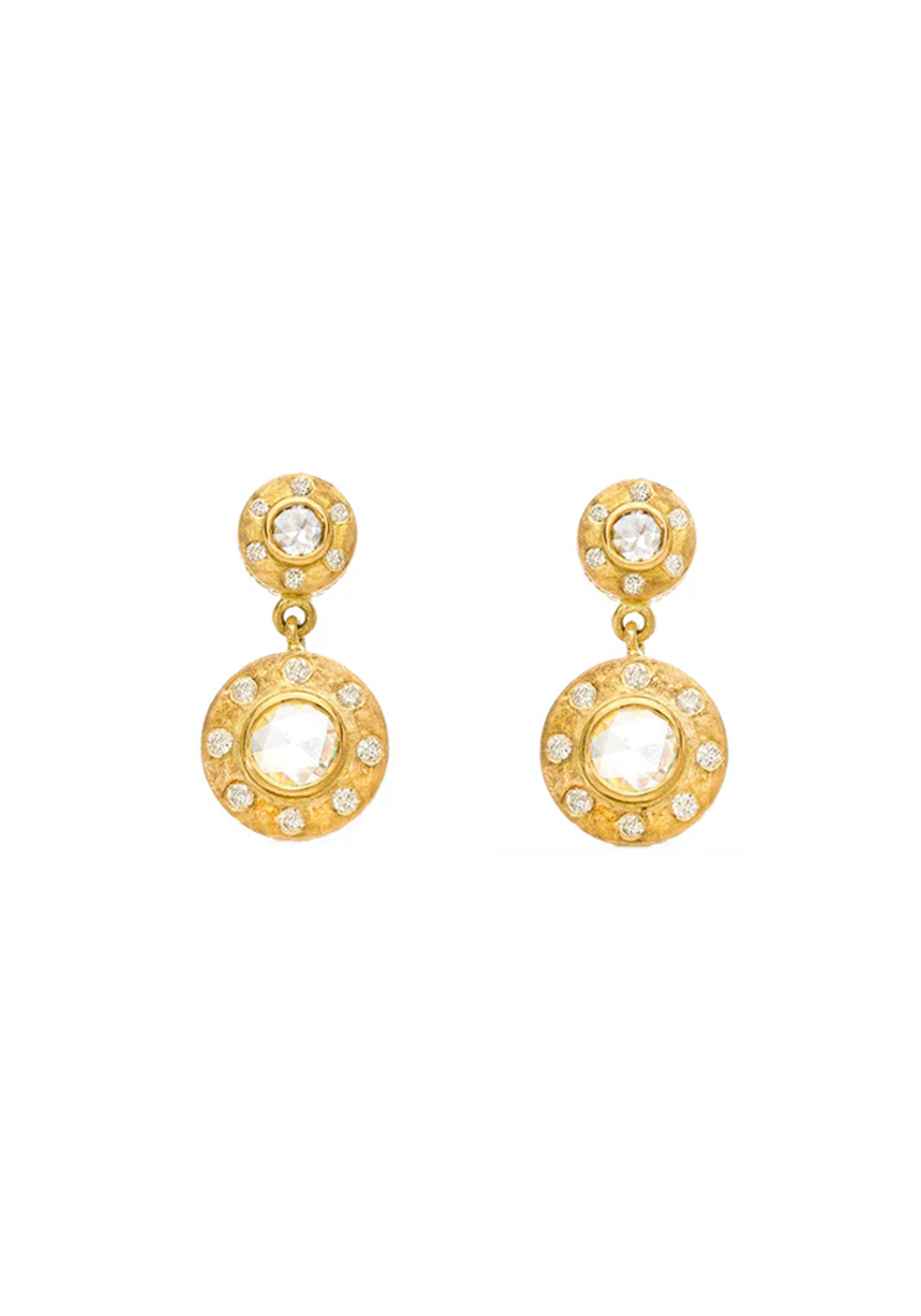 The Sethi Couture Dunes Classic 18K Yellow Gold Diamond Double Drop Earrings evoke timeless elegance with their heritage-inspired design. Featuring luminous rose-cut white diamonds and a softly brushed gold finish, these earrings exude vintage sophistication, offering a refined nod to the beauty of the past.