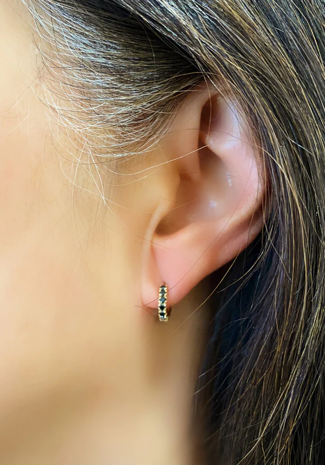 Simply stunning, these mini huggie earrings by Sethi Couture show off decadent black diamonds hugged by delicious 18k rose gold. Their petite size makes these earrings an ideal choice to bring a little sparkle to everyday whether worn by themselves, or paired with a 2nd or 3rd piercing for a playful and fun look.