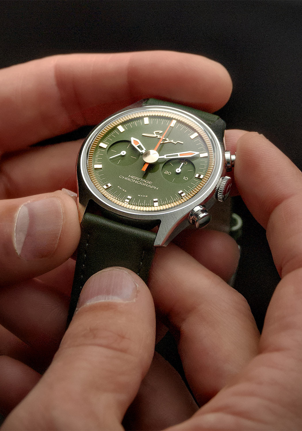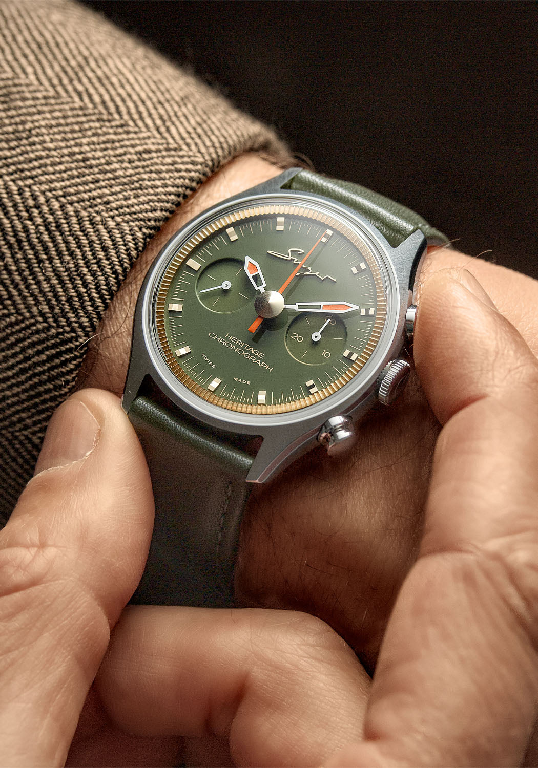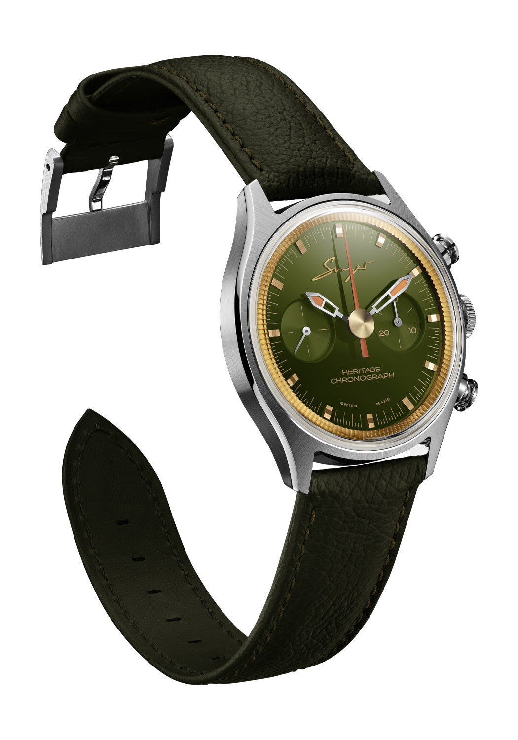 Encased in a refined 38.8mm stainless steel case with a sunray satin finish and mirror-polished chamfers, the Heritage Collection seamlessly bridges vintage aesthetics with modern precision. The watch features Singer’s signature toothed golden flange, applied faceted indices, and lacquered dials available in two variations: Empire Green (shown here), a deep lacquered finish with mirror-polished appliques and Piano Black Lacquered, exuding timeless sophistication. A sapphire crystal case back offers a glimpse into the restored Valjoux 236, while the chronograph function includes a large central seconds hand and a 30-minute counter at 3 o’clock. With a 48-hour power reserve, central hours and minutes, and a small seconds counter at 9 o’clock, the Heritage Collection is an exquisite fusion of restoration and reinvention. Limited to just 100 pieces in 2025, this collection is a testament to Singer Reimagined’s commitment to precision, heritage, and horological artistry.