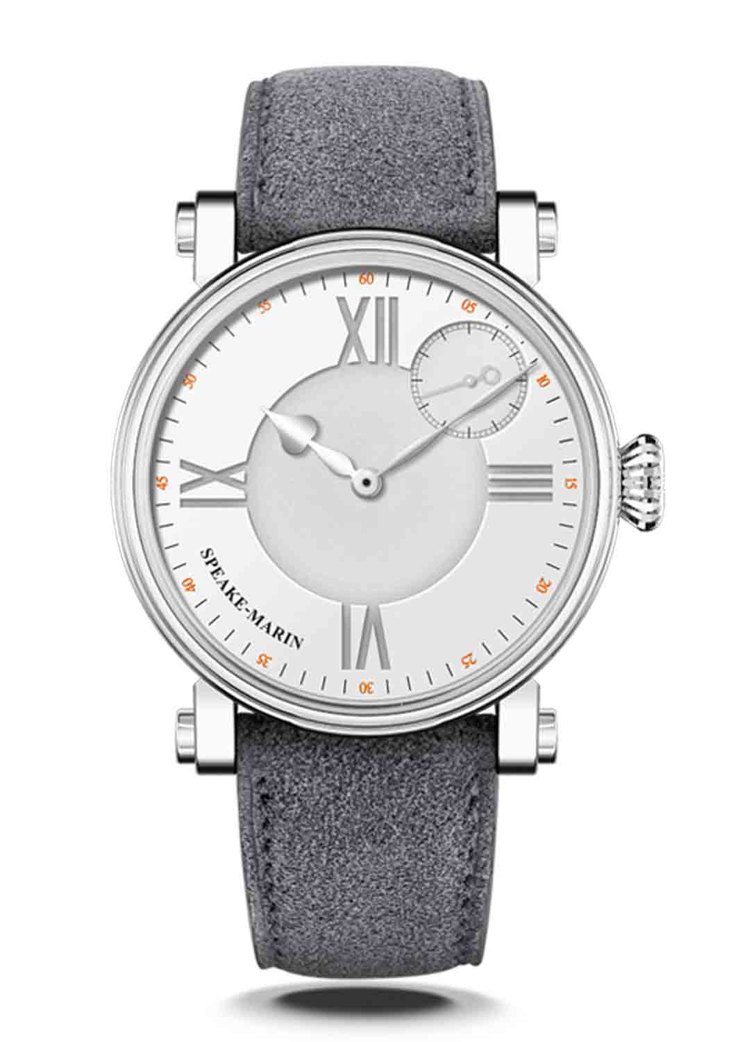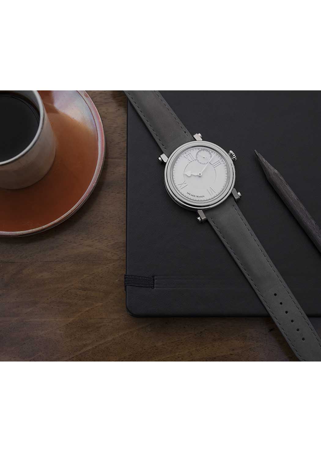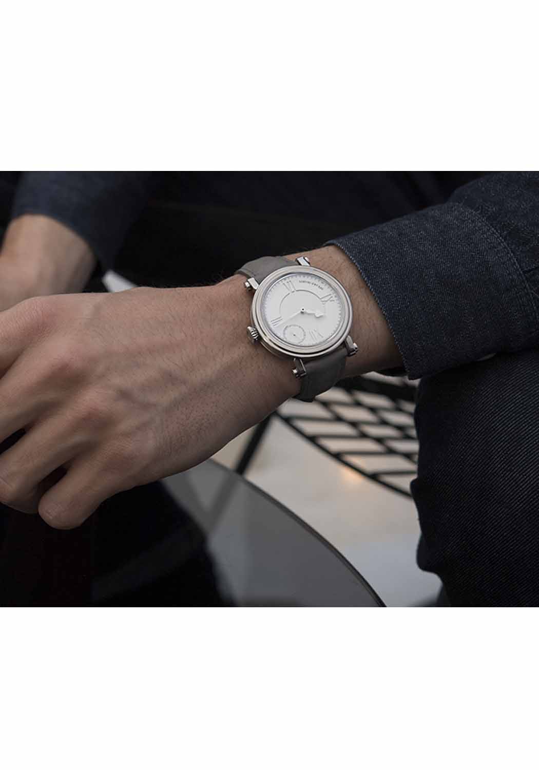 The One & Two Academic model features the SMA03 Calibre with micro-rotor and small seconds at 1:30. This model as designed by Eric Giroud has kept the signature elements of Speake-Marin in place but with a refreshingly modern feel. The case has been thoughtfully redesigned with a sleeker look and more ergonomic lugs for incredible comfort while wearing.