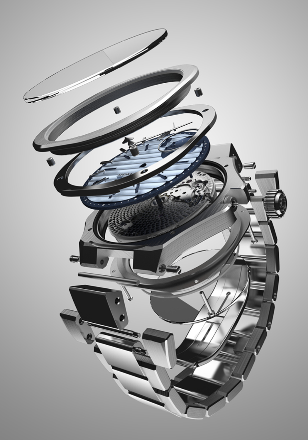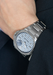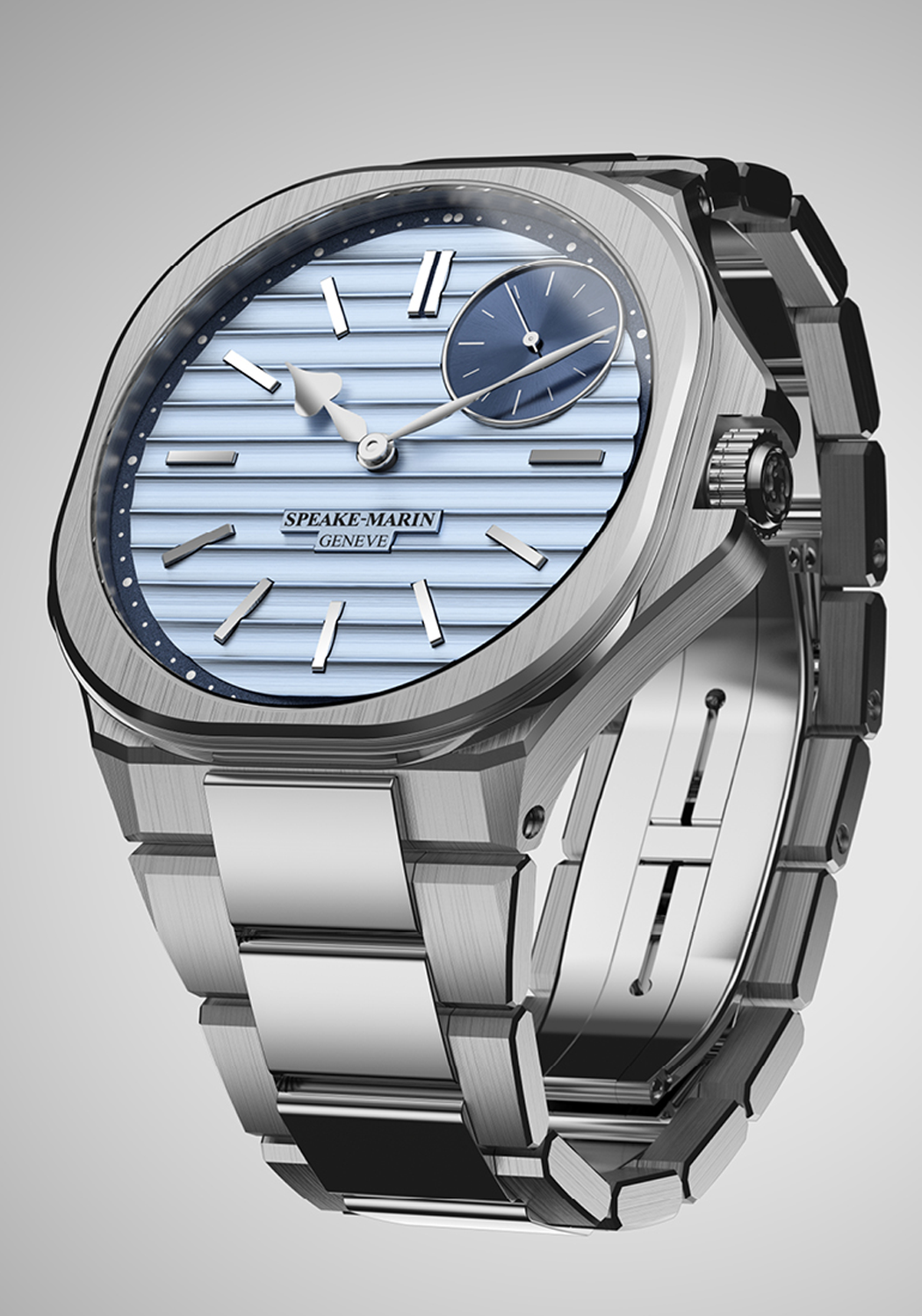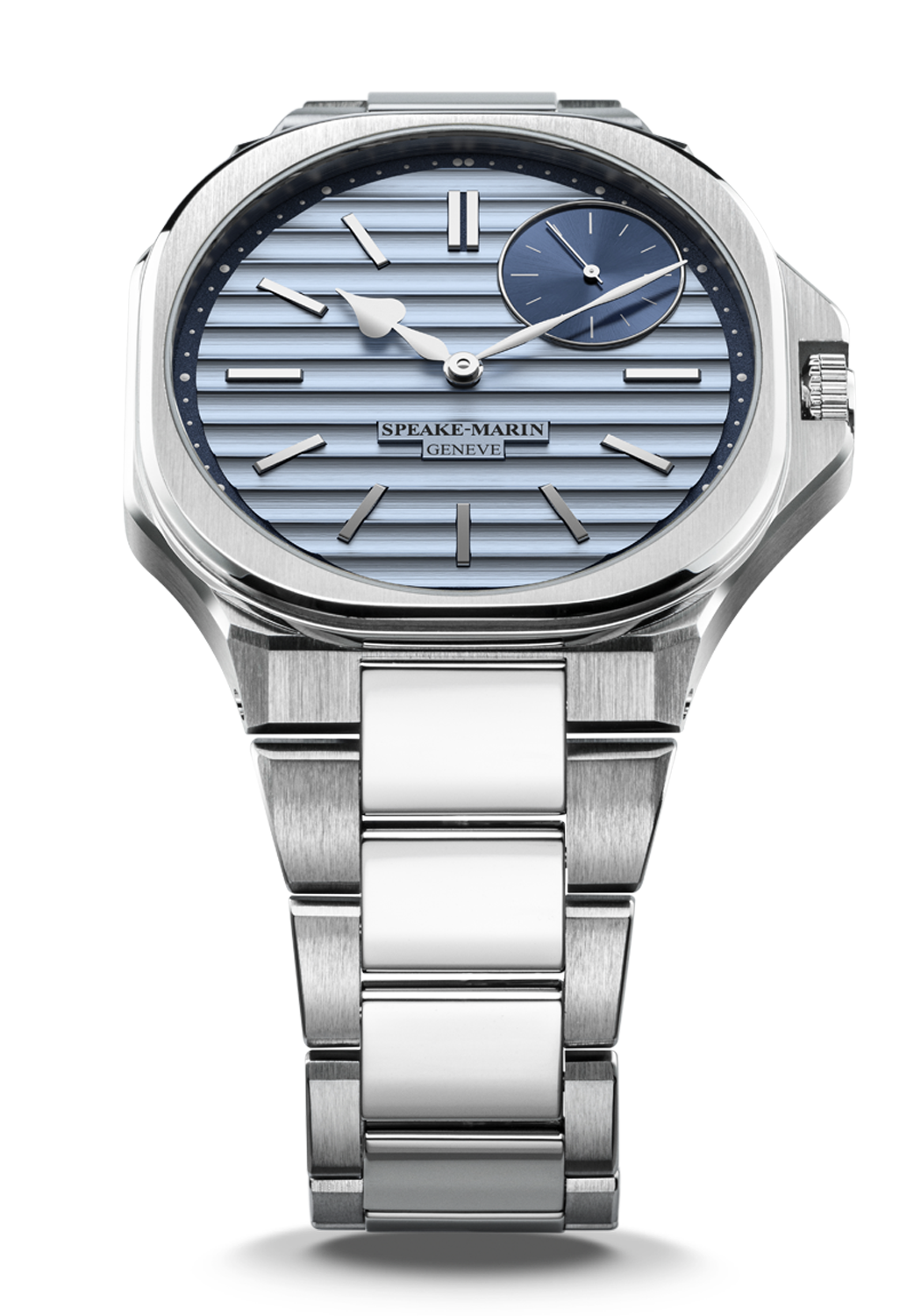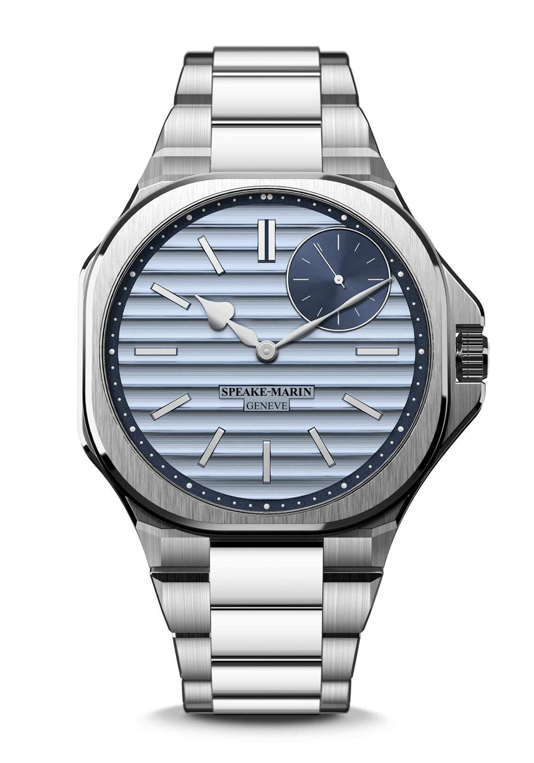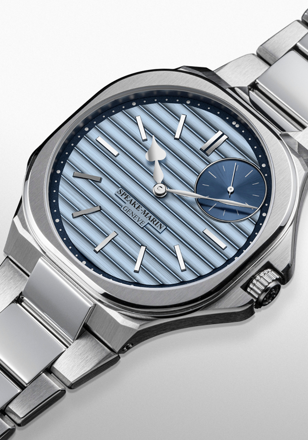 - Light and dark blue dial with Ripples finishing and polished indexes