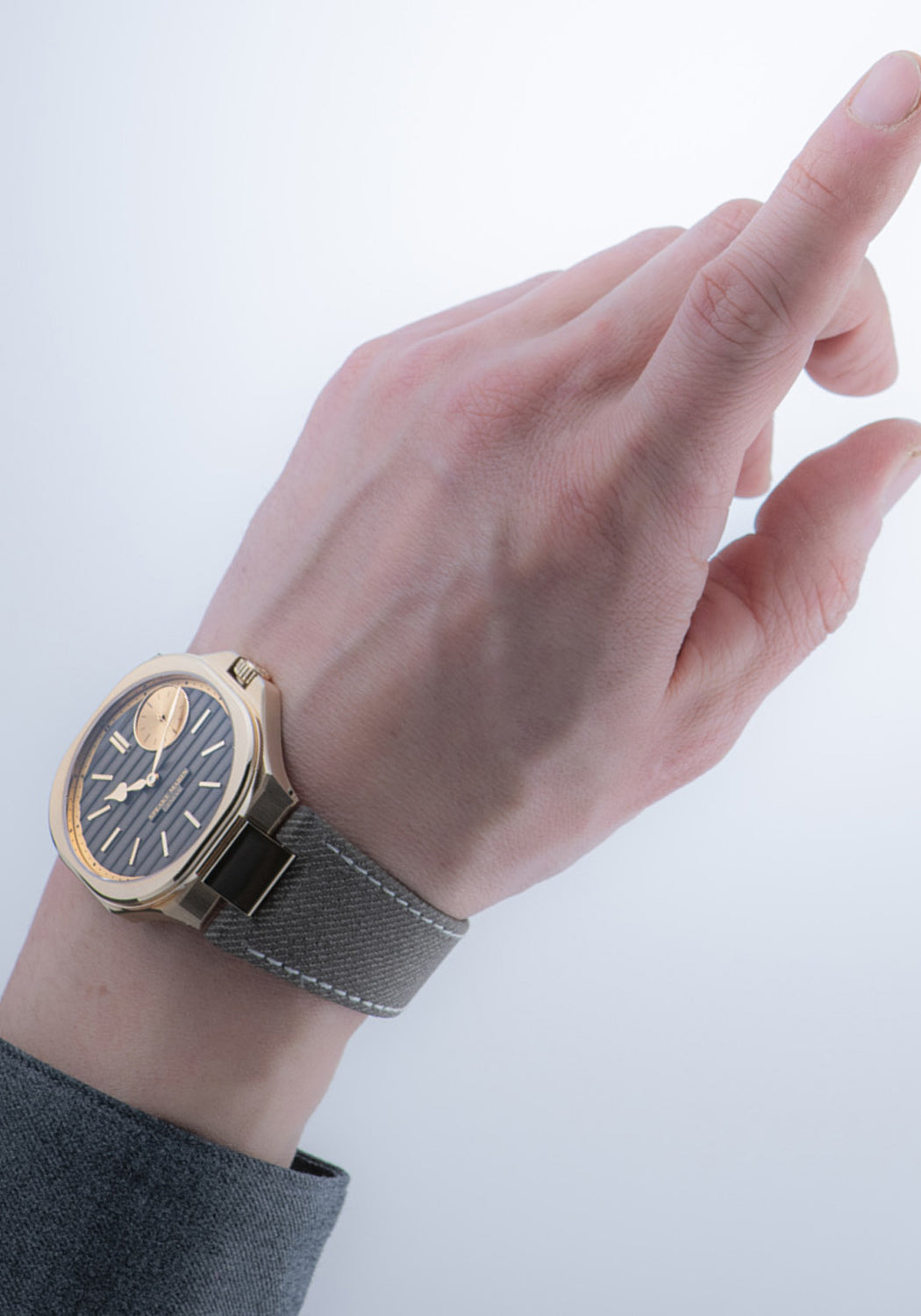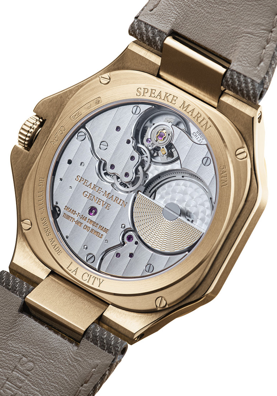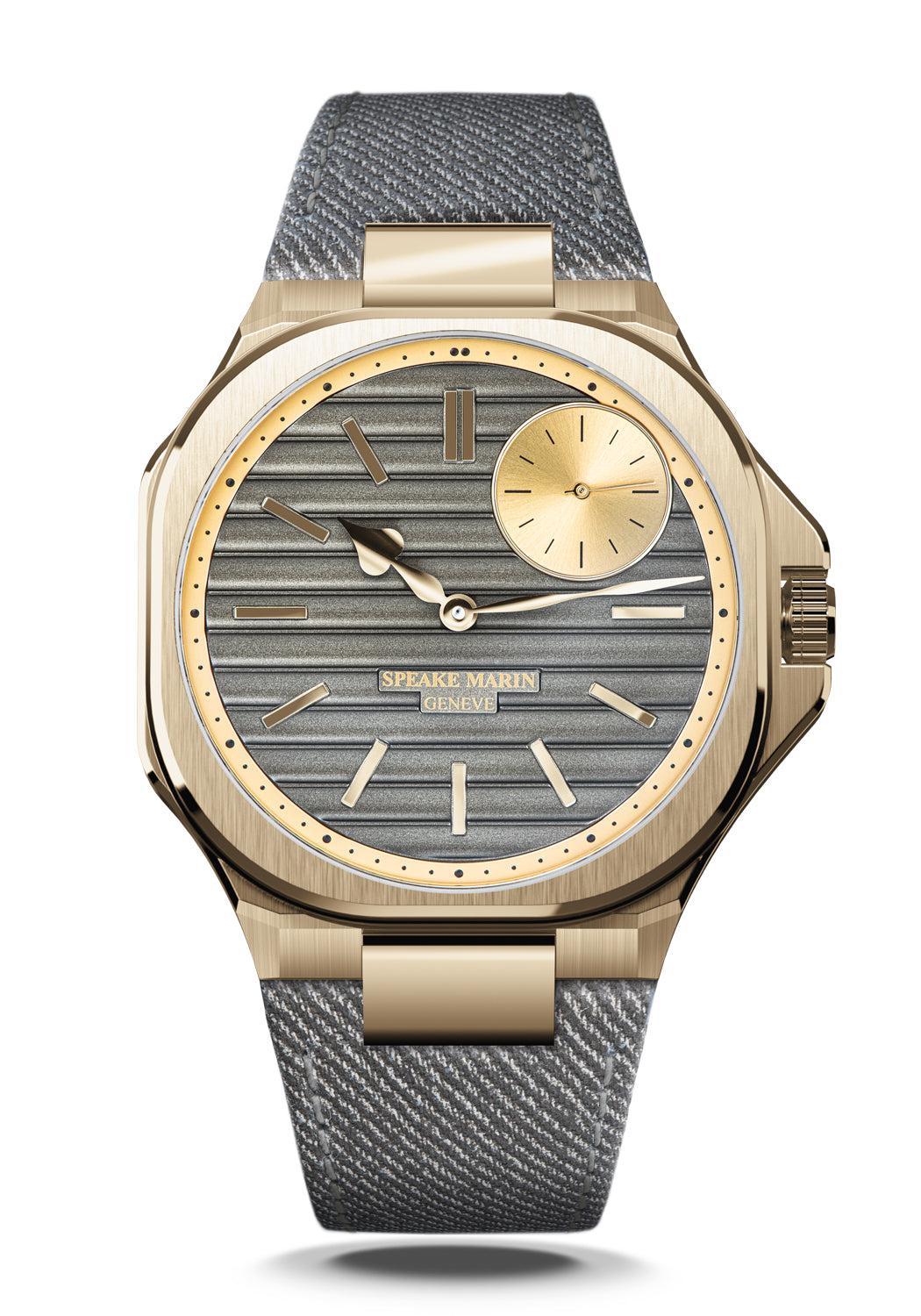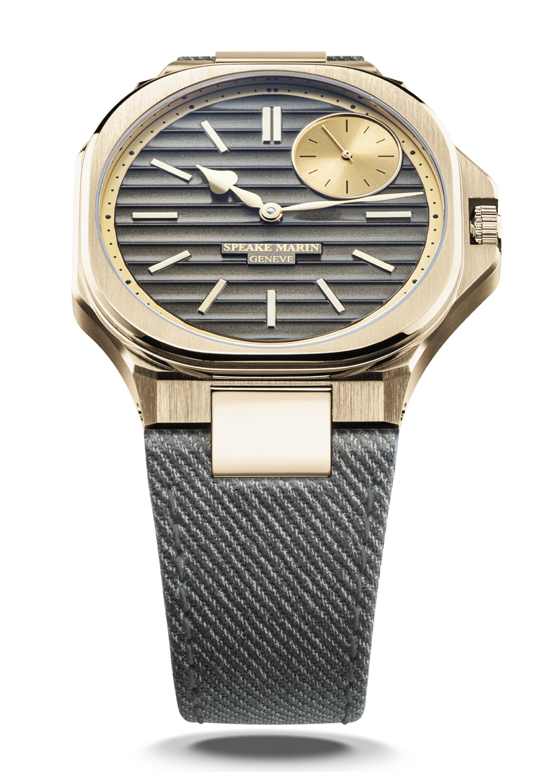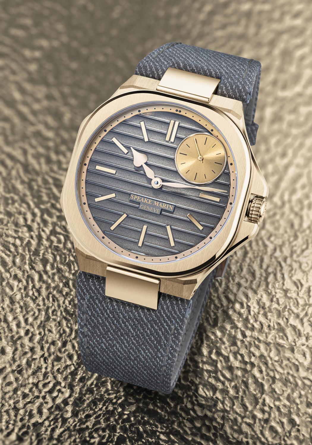 Speake Marin unveils the Ripples Gold, a refined expression of contemporary haute horology infused with timeless elegance. Encased in 4N ethical rose gold, the signature La City case—designed by Stéphane Lacroix—harmonizes circular and square elements in a sophisticated 40.30mm architecture composed of 40 precision-engineered components. Certified by the Responsible Jewellery Council (RJC), the gold used is responsibly sourced, ensuring both sustainability and luxury. The warm glow of the rose gold is enhanced by meticulous satin-brushed and polished finishes, a distinctive square bezel with bevelled edges, and a protected screw-in crown featuring a laser-engraved logo. An anti-reflective sapphire crystal safeguards both the dial and case back, while a mocha-colored calf leather strap with an embossed denim motif adds a contemporary touch, secured by a 4N rose gold and titanium folding clasp.