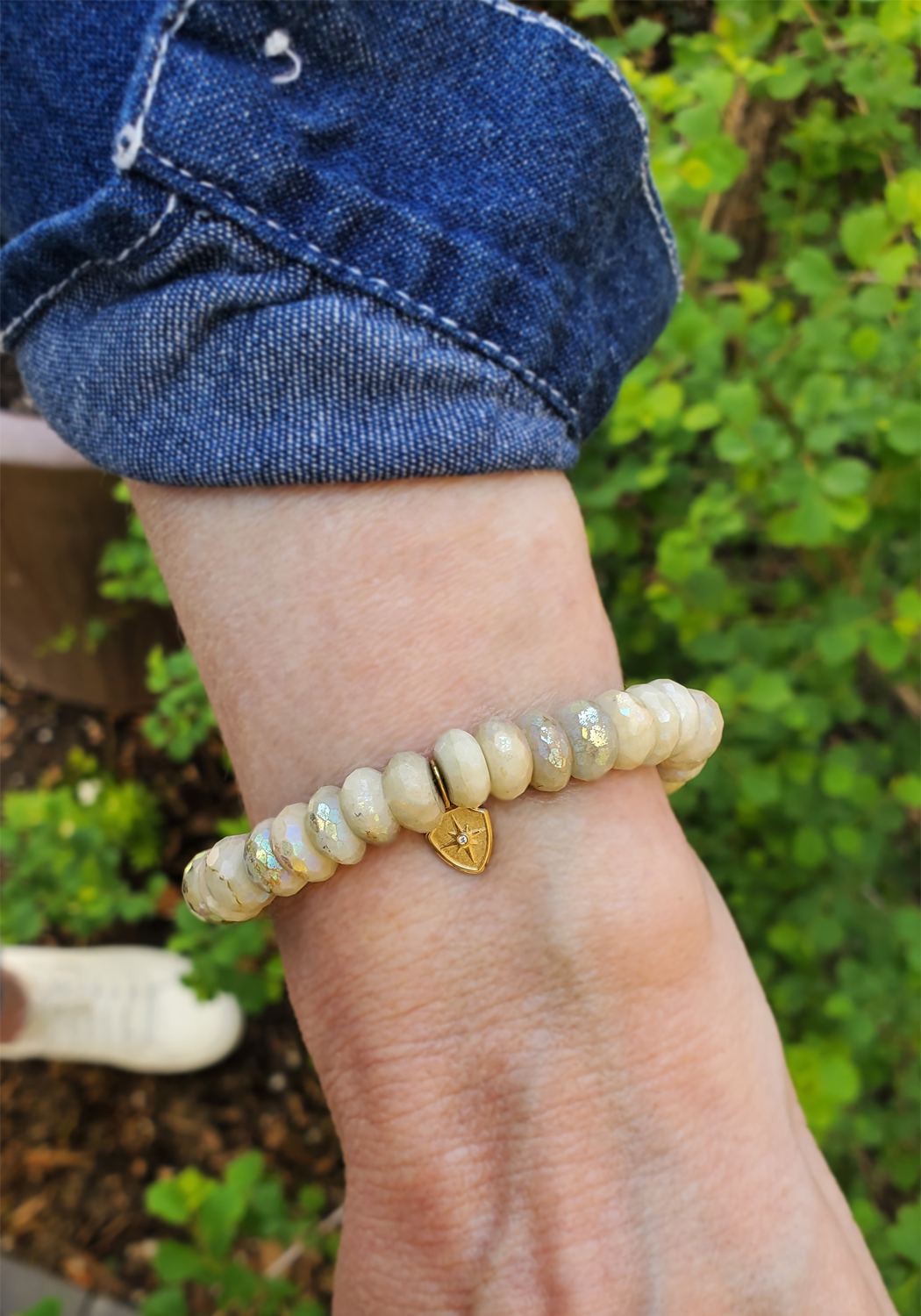 Like a guardian wrapped in gemstones, this Sydney Evan bracelet threads tranquil faceted aquamarine beads with a petite 14k gold shield charm, etched with a Moroccan star and lit from within by a single radiant diamond. The star, an ancient symbol of harmony and guidance, sits at the heart of the shield—offering a quiet sense of strength, purpose, and beauty. Worn alone or layered, it’s a graceful nod to resilience wrapped in serenity.