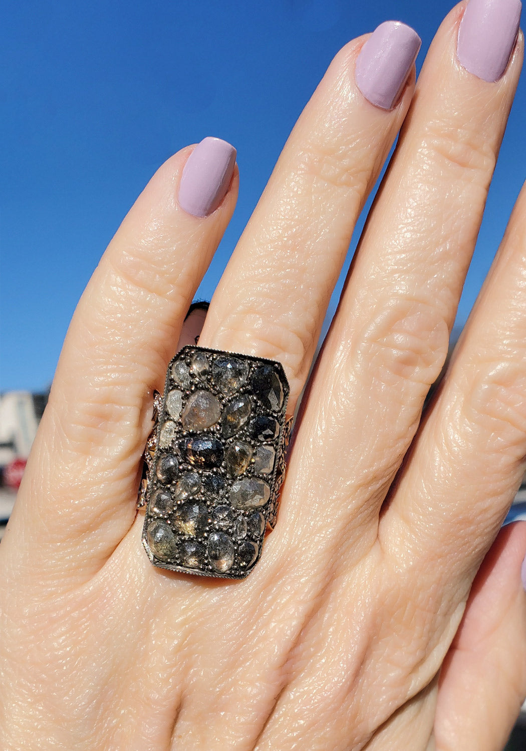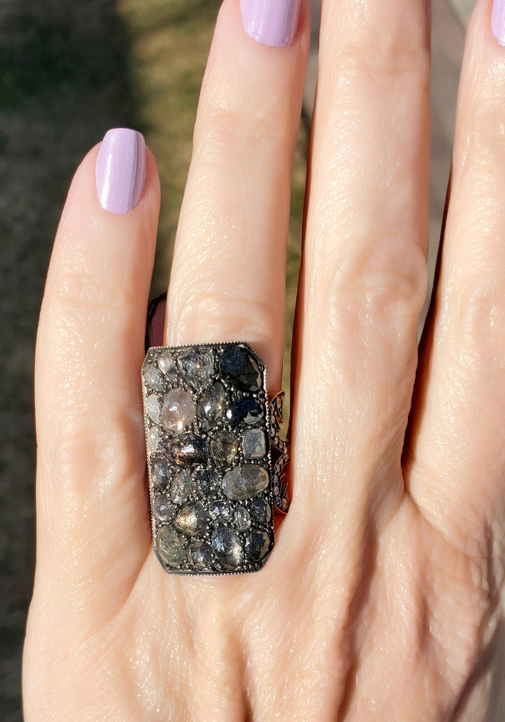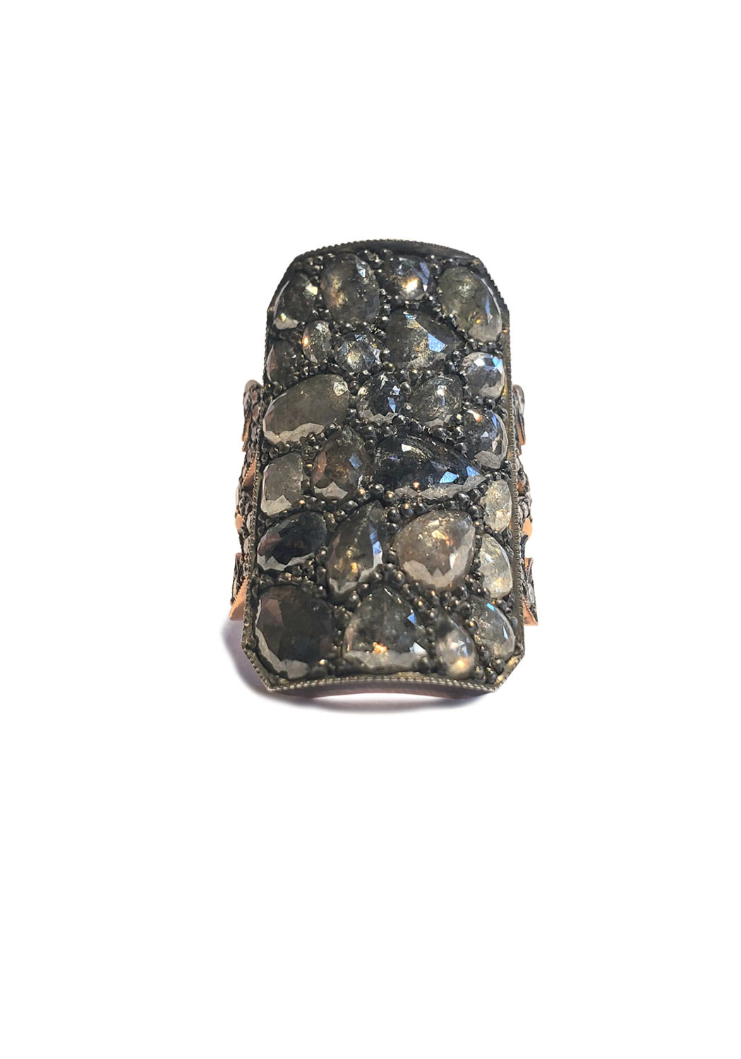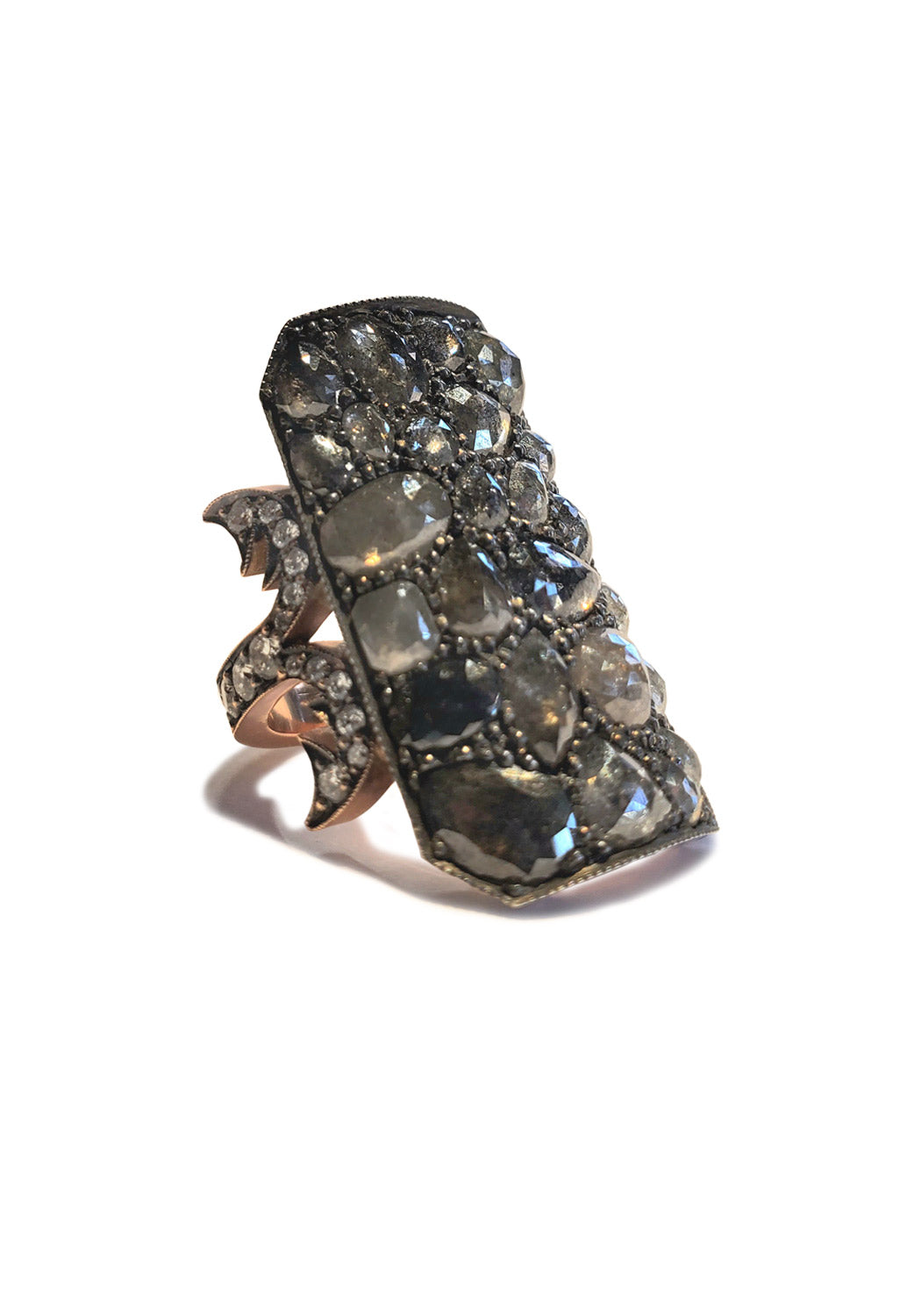 This shield ring is part of Sylva & Cie's Ten Table Project - Rings that can be seen from ten tables away. An array of rosecut diamonds are artfully arranged on their own expansive rose gold "table top," elegantly curved for maximum effect. This cocktail ring is a stunner that wears spectacularly by itself, or accented with other favorite pieces.