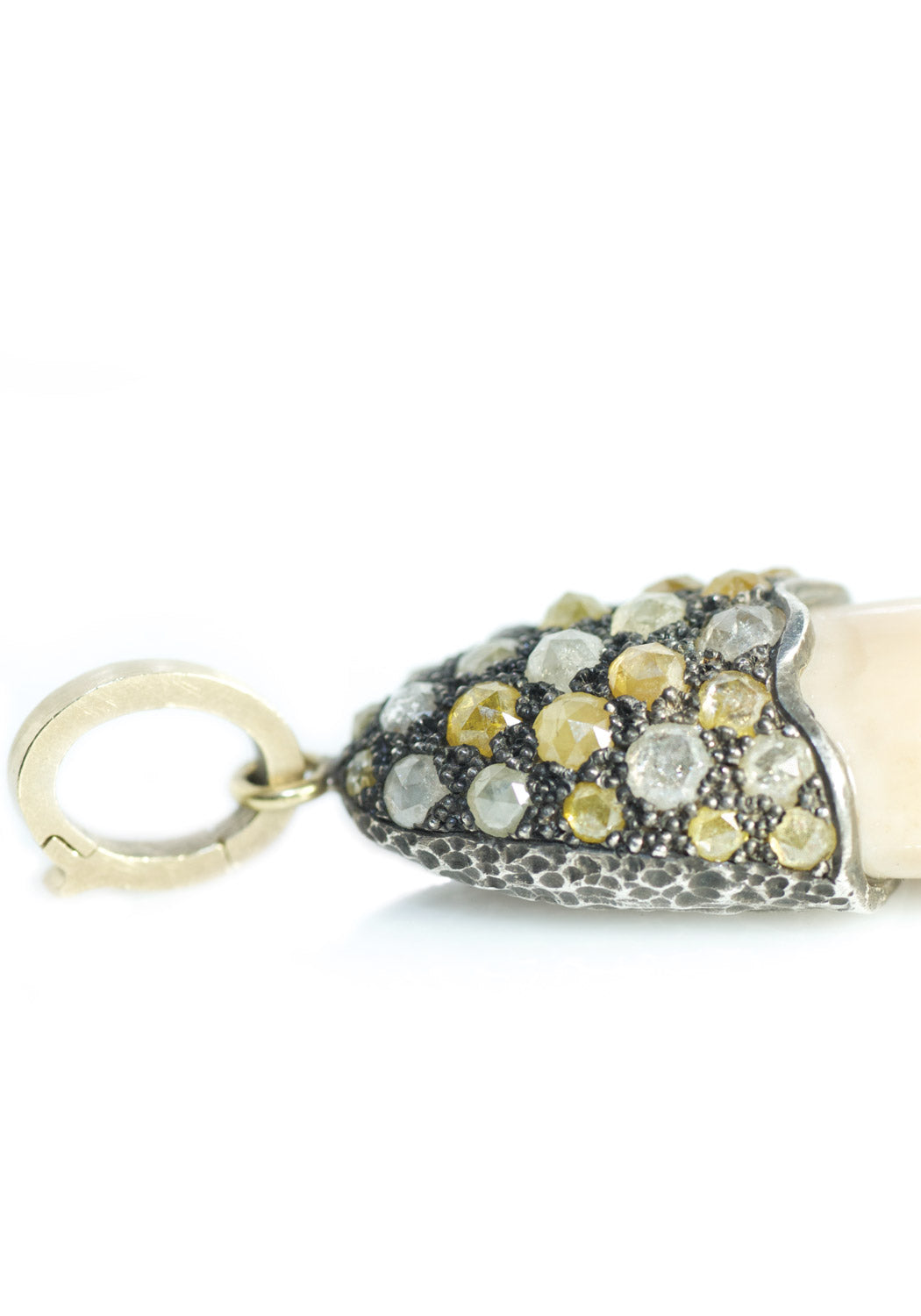 Sylva & Cie's 18K Yellow Gold & Oxidized Silver Diamond Tusk Pendant is a striking piece of jewelry art. This 2.5" long pendant featuring a fossilized tusk showcases a unique blend of 18k yellow gold and oxidized sterling silver that creates a captivating contrast. Adorned with 3.42 carats of rough diamonds, the pendant exudes a rugged elegance. Perfect for making a bold statement, this pendant adds a touch of distinctive charm to a favorite chain for any look.