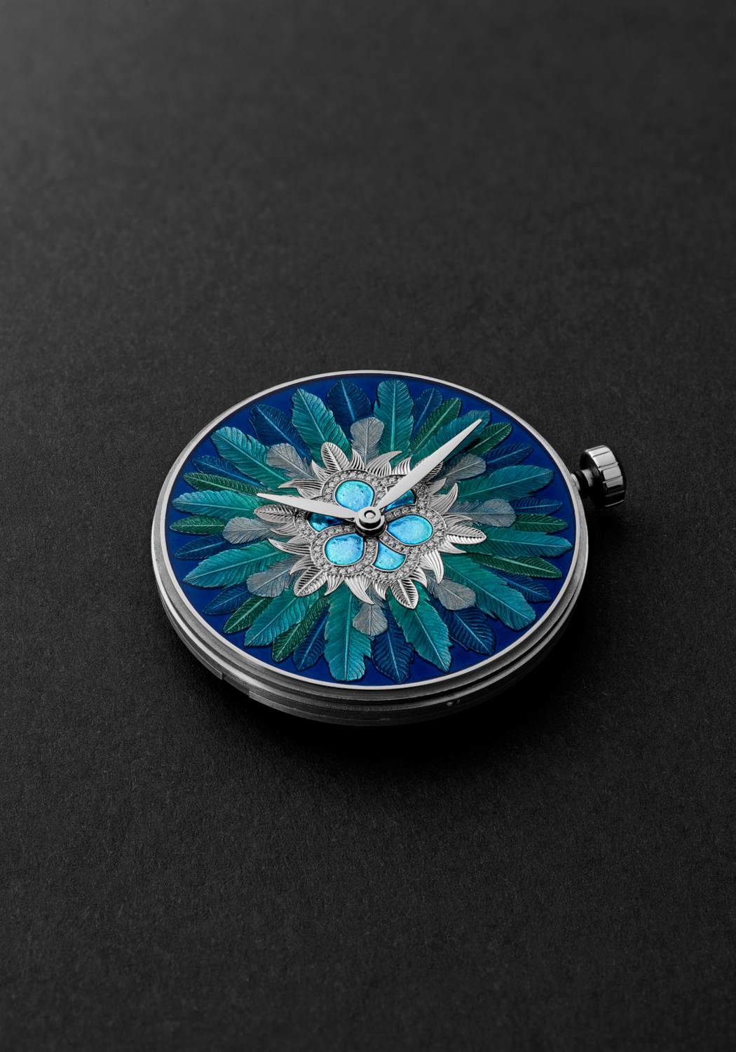 Engraved feathers adorned with enamel, a floral silver-leaf pailloné encircled by diamonds come together on the TAOS Envol Bleu. These intricate layers, firings, and micro-engravings create a stunning rosace pattern. Each detail amplifies the blooming beauty, showcasing unparalleled craftsmanship and artistic finesse.