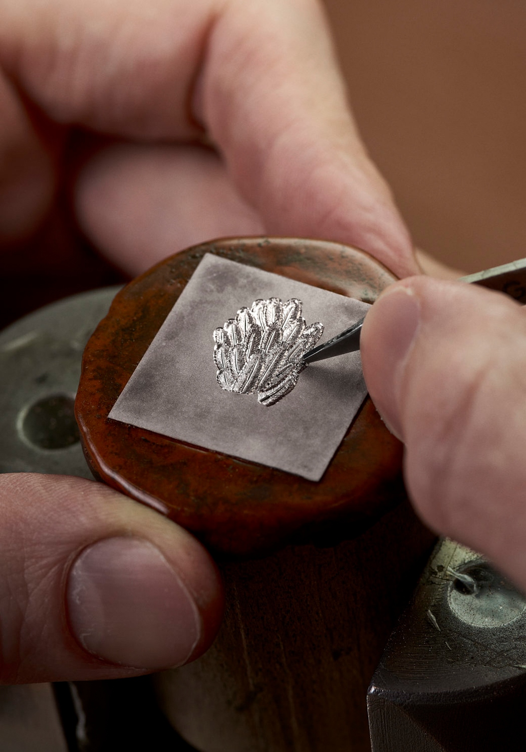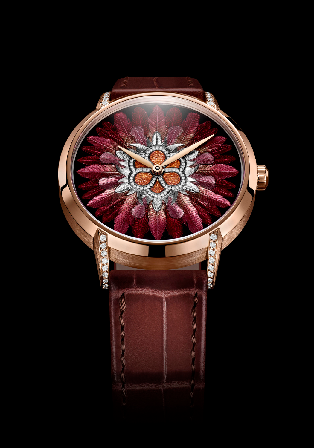 Engraved feathers adorned with enamel, a floral silver-leaf pailloné encircled by diamonds—these intricate layers, firings, and micro-engravings create a stunning rosace pattern. Each detail amplifies the blooming beauty, showcasing unparalleled craftsmanship and artistic finesse.