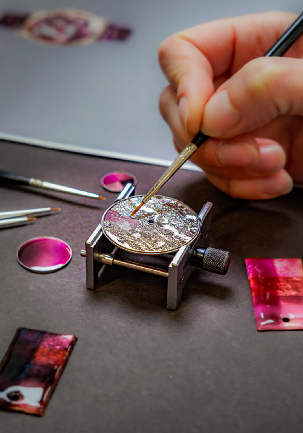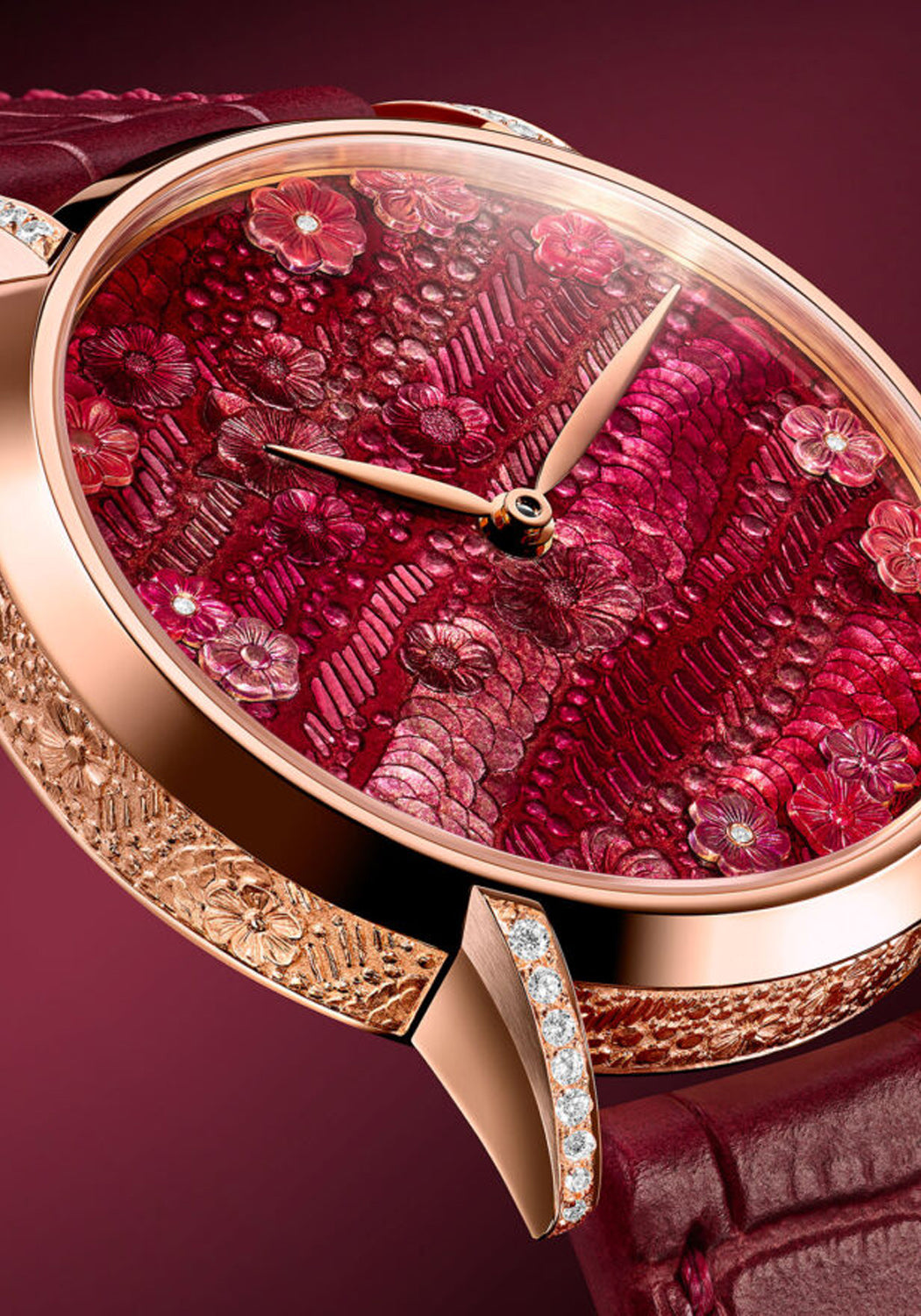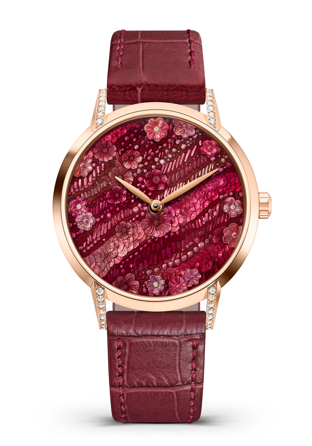 Drawing inspiration from the intricate art of sequins, a symbol of luxury and craftsmanship since the Middle Ages, the TAOS Sequin watch transforms timekeeping into a masterpiece of haute couture. The dial features raised hand-engraving and translucent enamel in a rich red-to-burgundy gradient, recreating the luminous sparkle of sequined embellishments. Each sequin-like element captures light and depth, while delicately hand-painted gold appliqués and precise gem-setting reflect the artistry of high-end craftsmanship. The result is a timepiece that harmonizes tradition, innovation, and sophisticated design for those who appreciate the artistry of fine watchmaking.