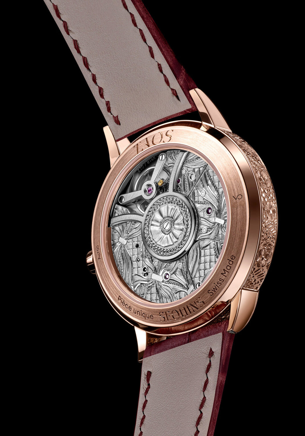 At the heart of this exquisite creation lies the VOP318 caliber, exclusively developed by Télôs in La Chaux-de-Fonds for TAOS. This self-winding, double-barrel movement, with its invisible oscillating weight hidden within the case, is adorned with exclusive hand decorations by Atelier Olivier Vaucher in Geneva. With a power reserve of approximately 72 hours, a frequency of 4 Hz, and 26 rubies for enhanced precision, the movement exemplifies TAOS’s dedication to technical mastery. Encased in 5N pink gold with intricate hand engraving and diamond-set lugs, the watch is paired with a hand-stitched, matte bordeaux leather strap featuring an alligator pattern and secured with a bespoke 5N pink gold pin buckle. The TAOS Sequin watch is a radiant tribute to elegance, blending the worlds of haute couture and horological innovation.